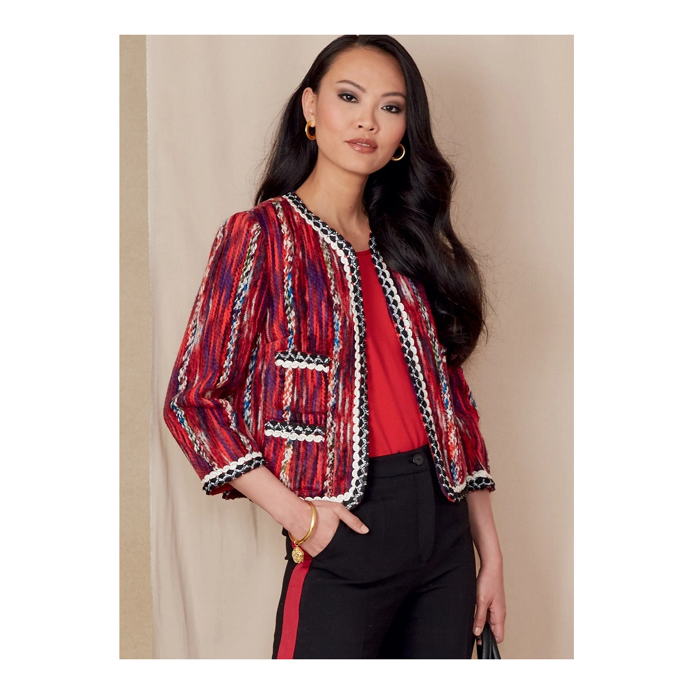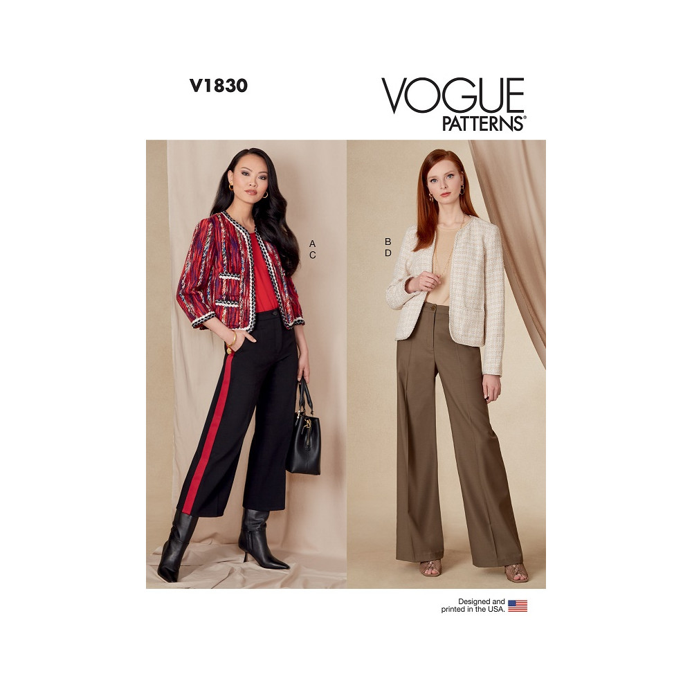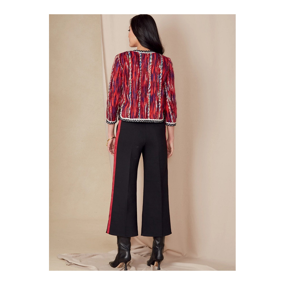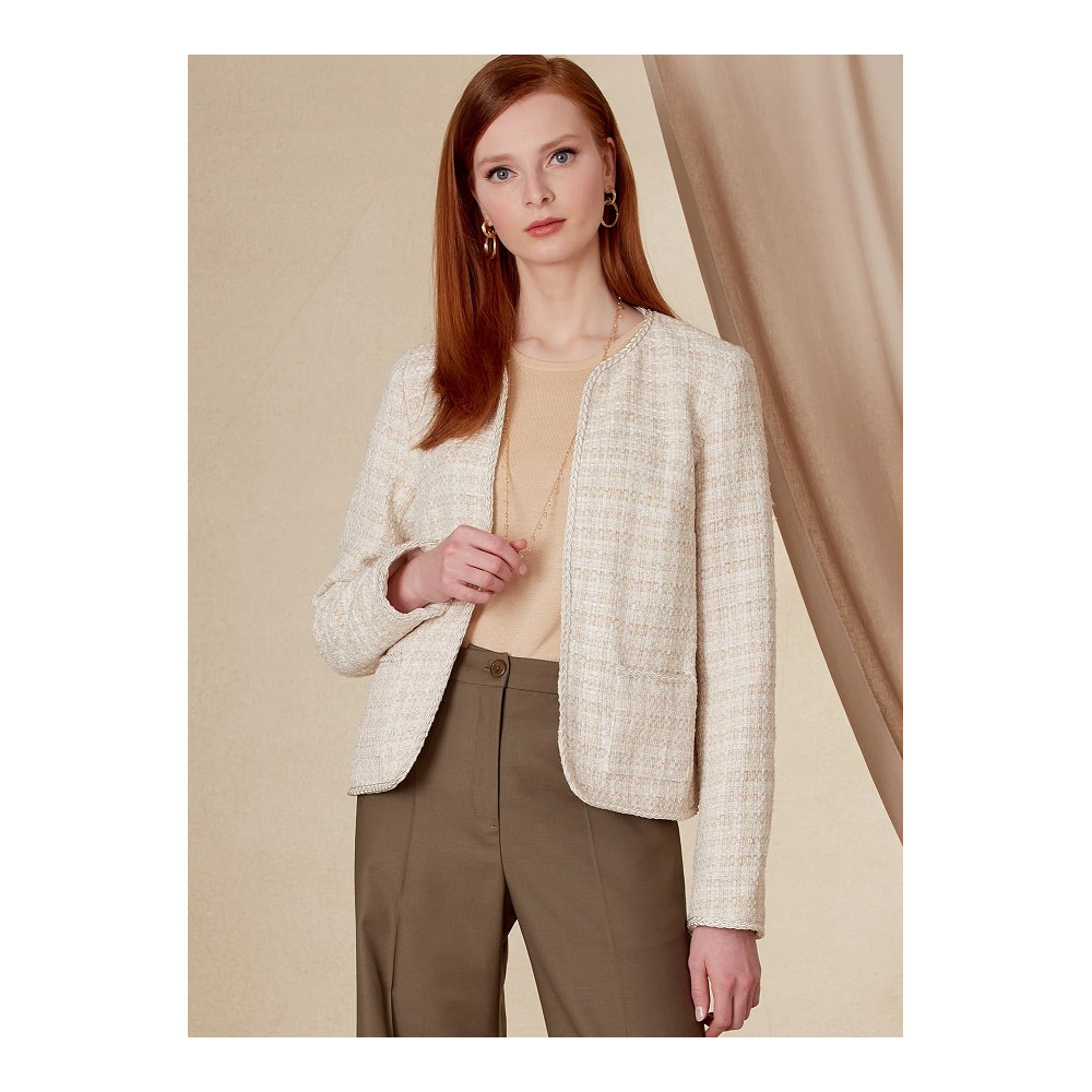 Střih Vogue na krátký otevřený francouzský kabátek (sako) lemovaný ozdobnou bortou a kalhoty se širokými nohavicemi