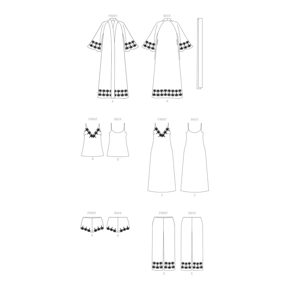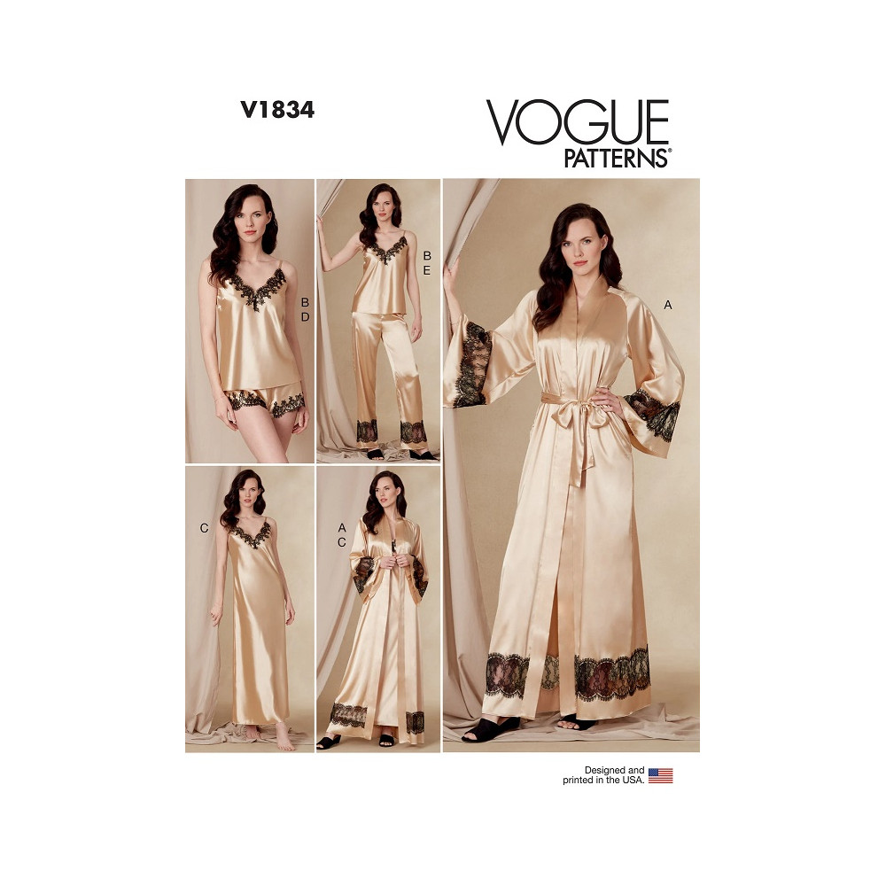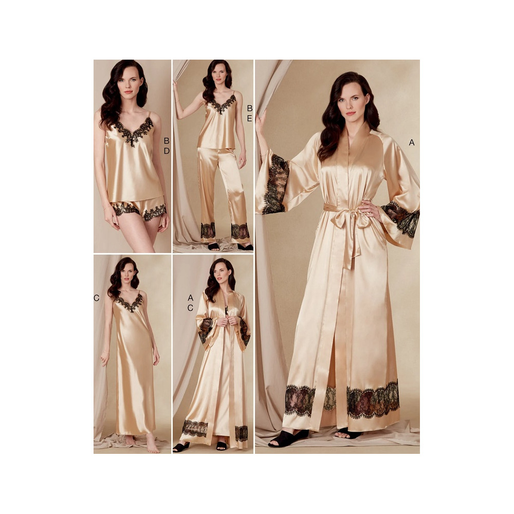 Střih Vogue na komplet dámského nočního prádla s krajkou: župan, negližé, košilka, šortky, kalhoty