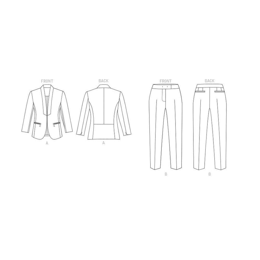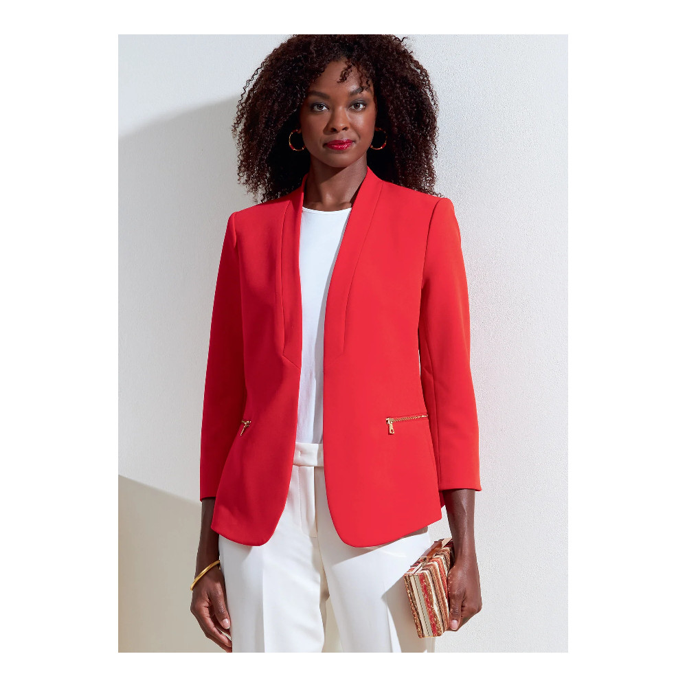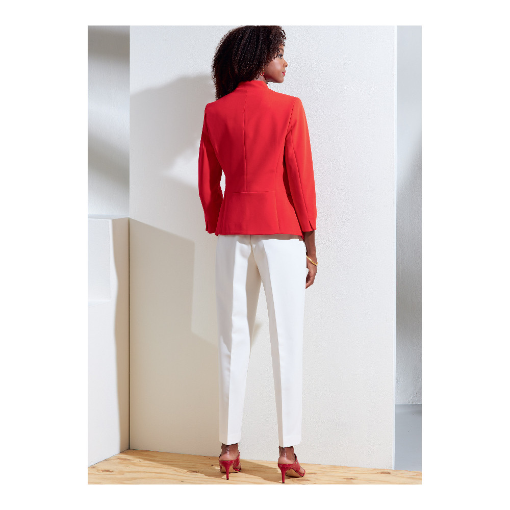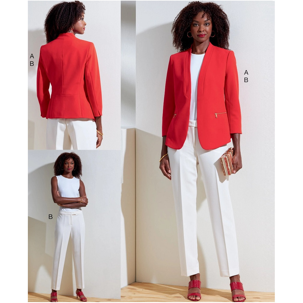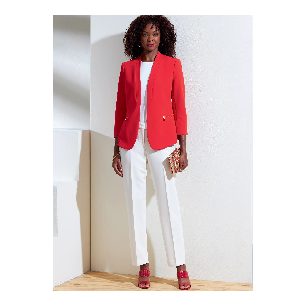 Návrhářský střih Vogue na otevřené sako s kapsami na zip a kalhoty s cigaretovými nohavicemi s puky