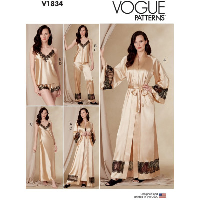 Střih Vogue na komplet dámského nočního prádla s krajkou: župan, negližé, košilka, šortky, kalhoty