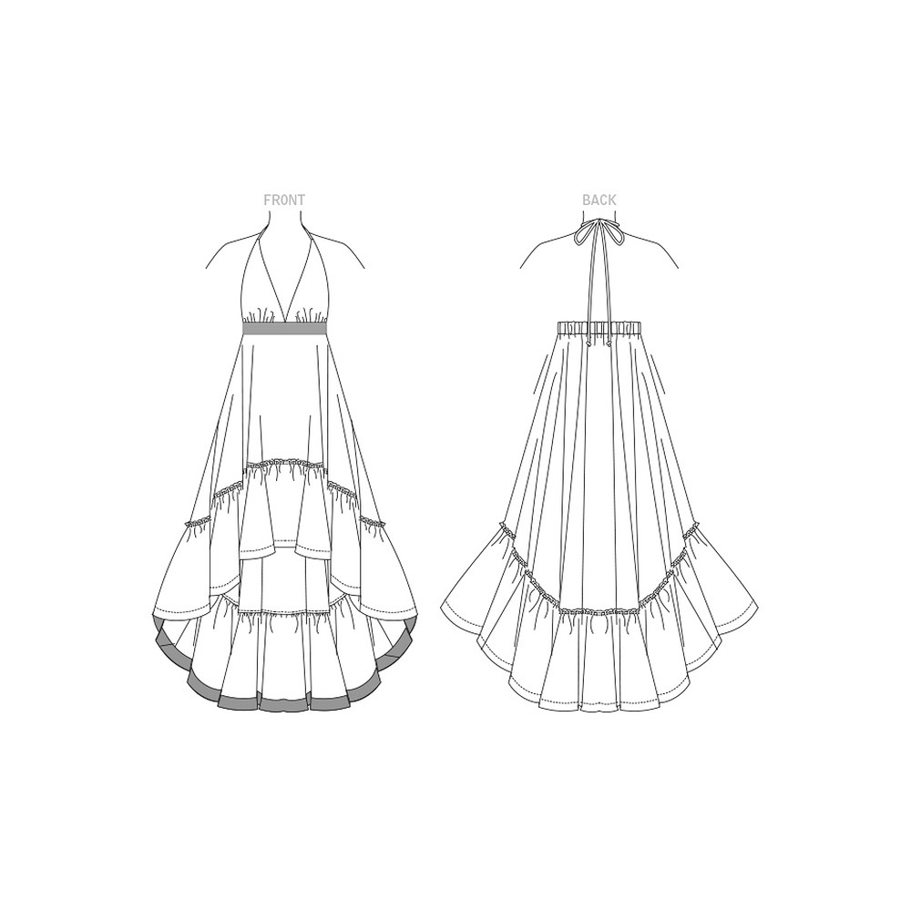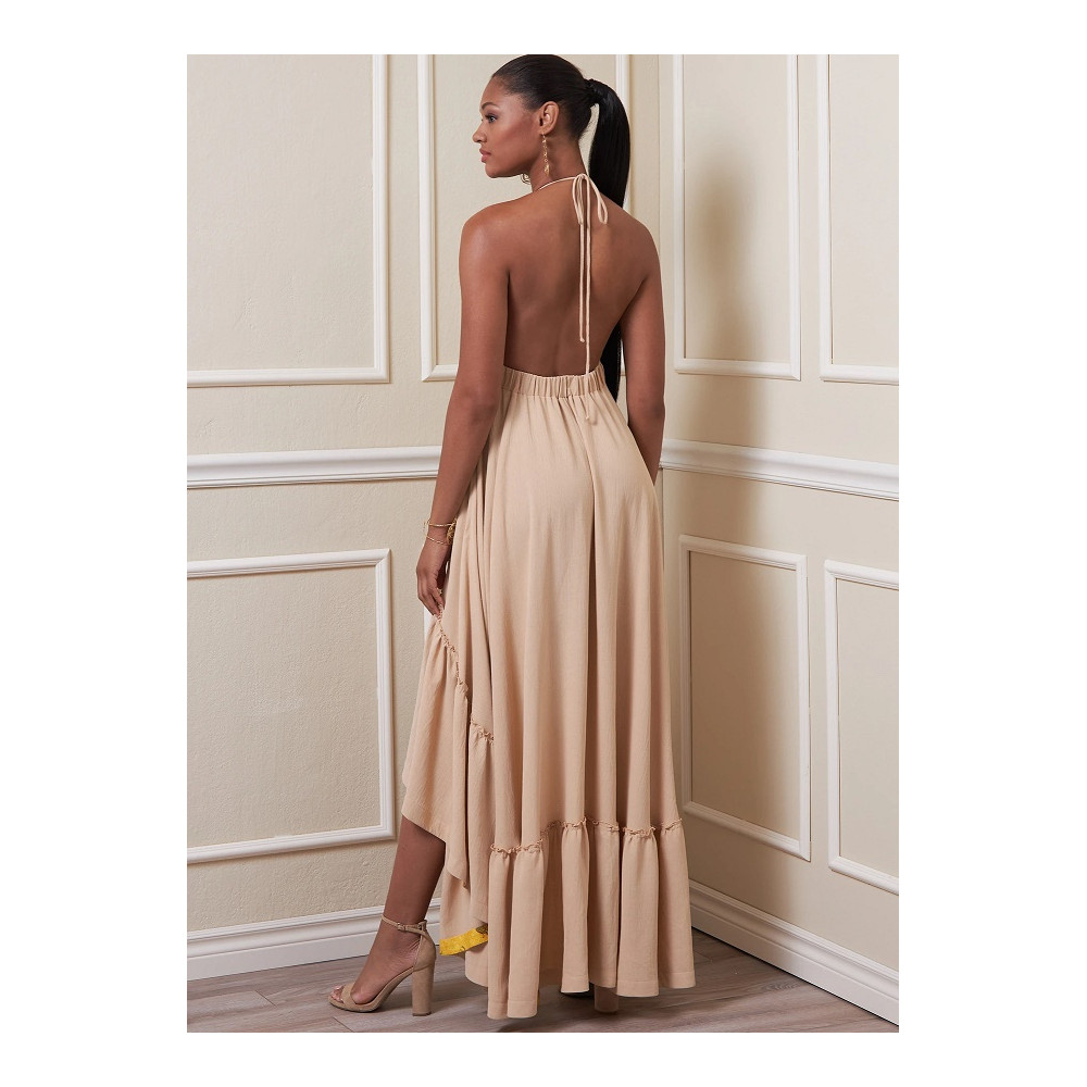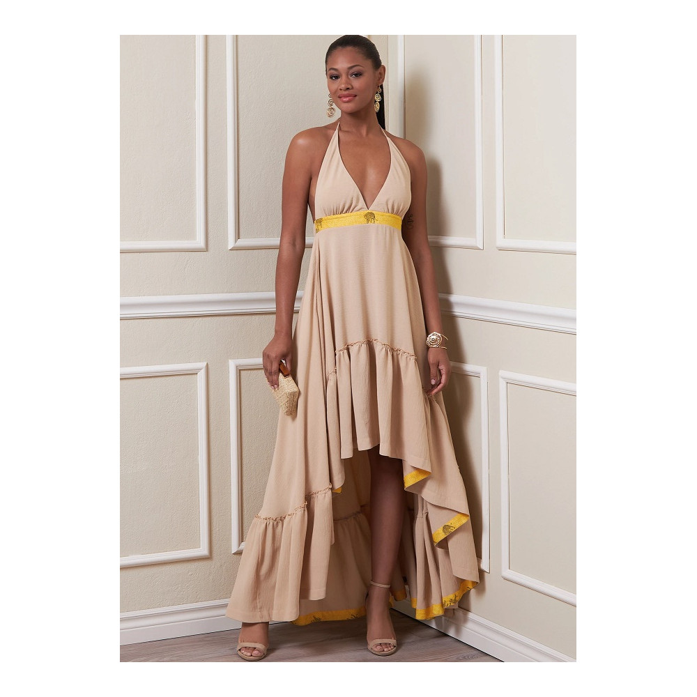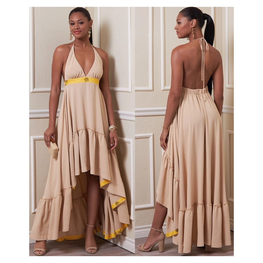 Návrhářský střih Vogue na šaty v empírové linii, s ramínky za krk, V-výstřihem, nahými zády a volánovou vykrojenou sukní