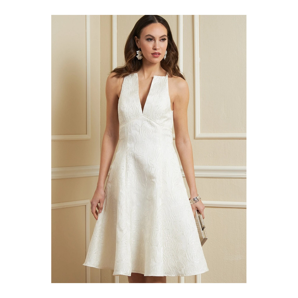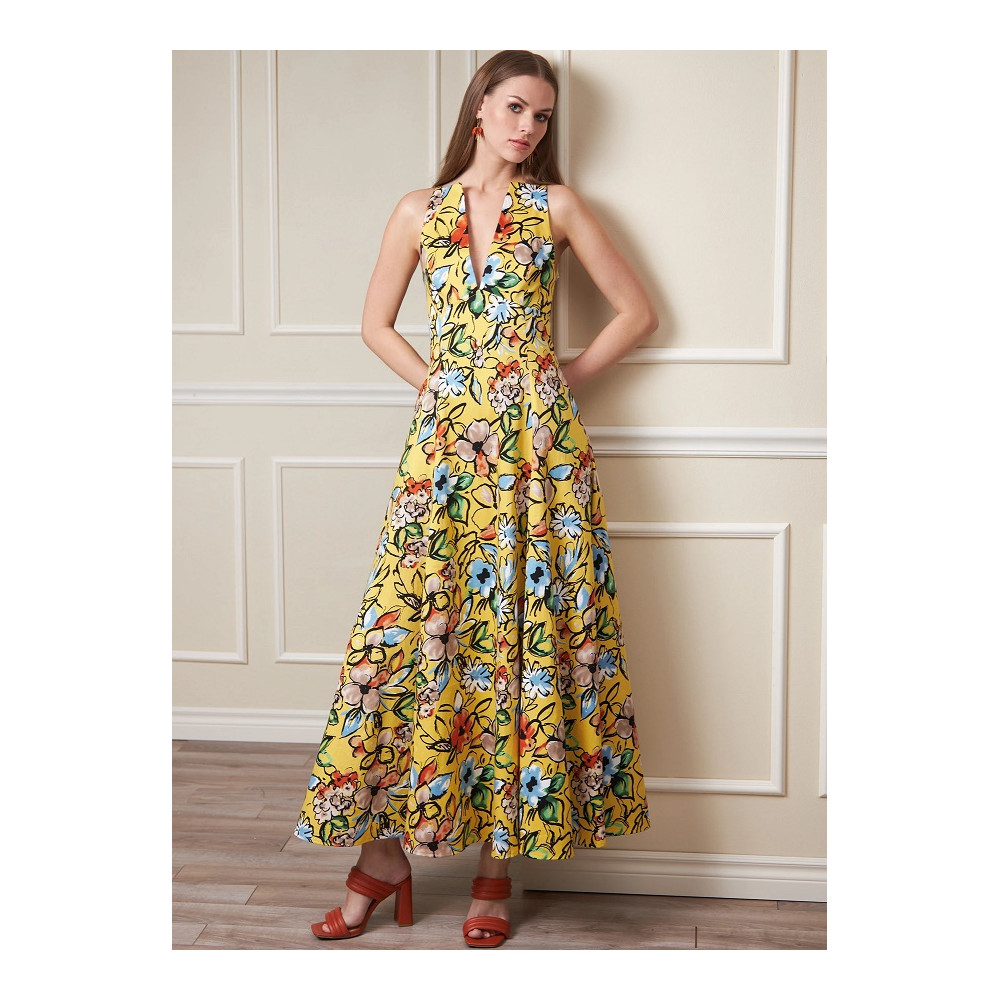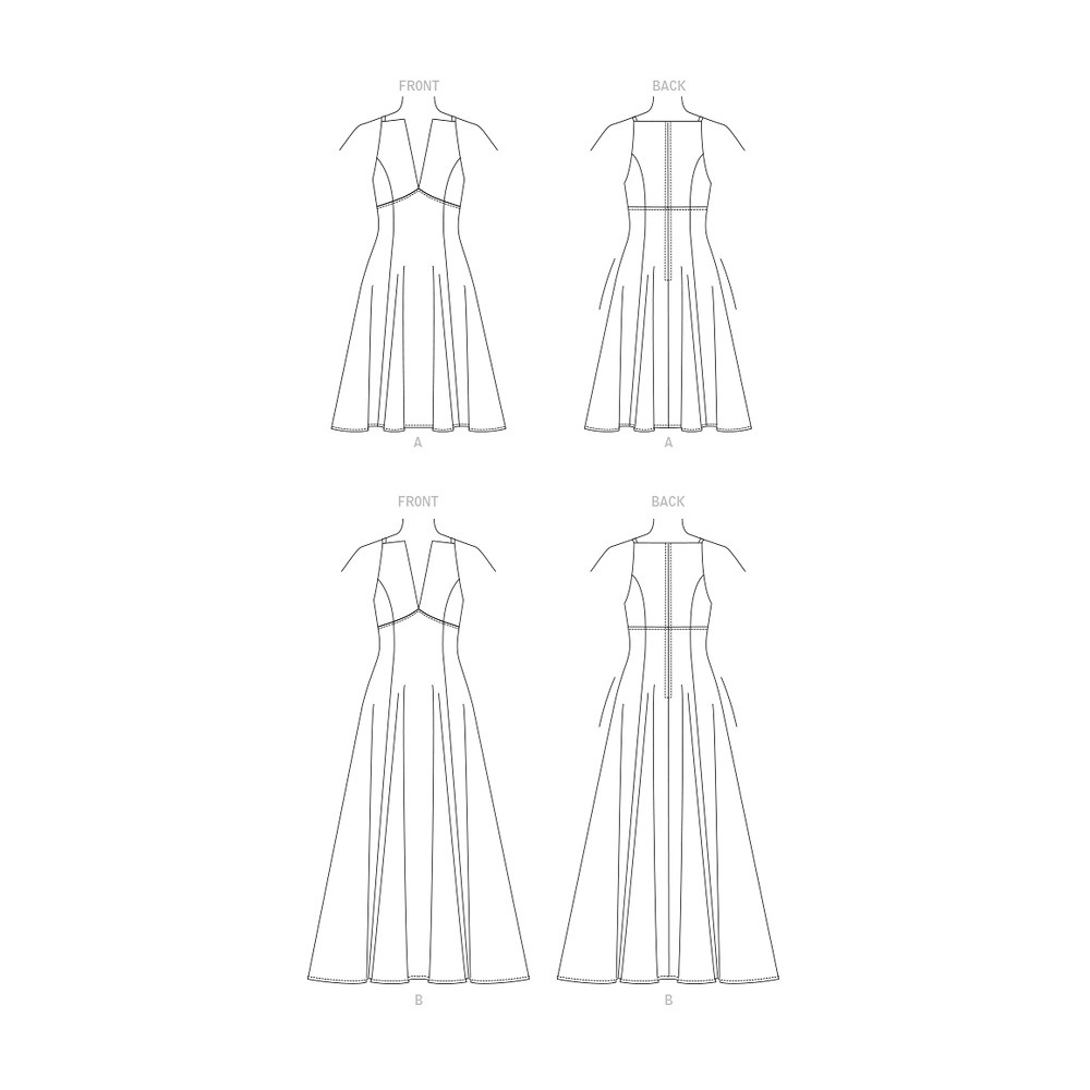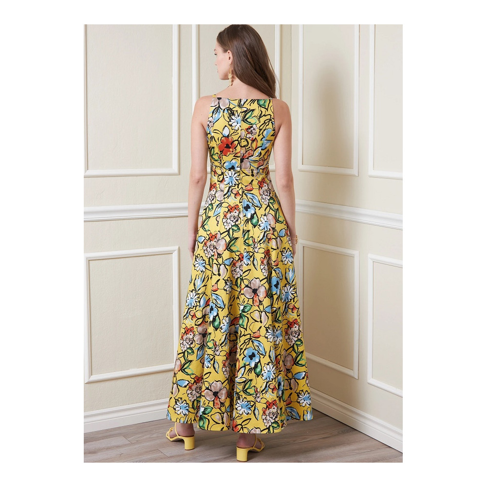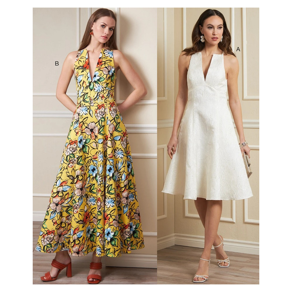 Střih Vogue na empírové šaty bez rukávů, s V-výstřihem, princesovými švy a rozšířenou sukní