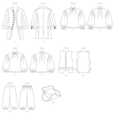 Střih Butterick na pánský historický kabát a vestu s jednořadým zapínáním, košili, kalhoty a klobouk