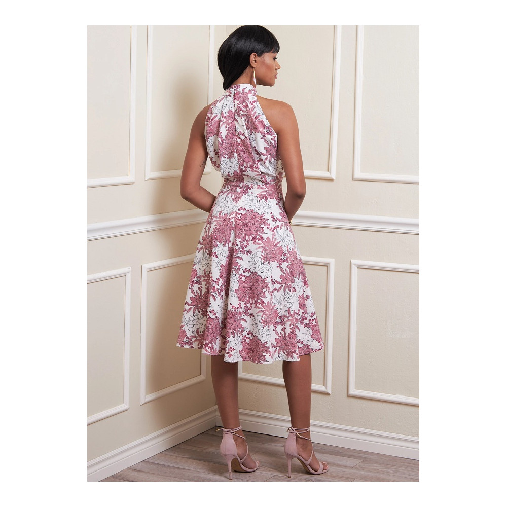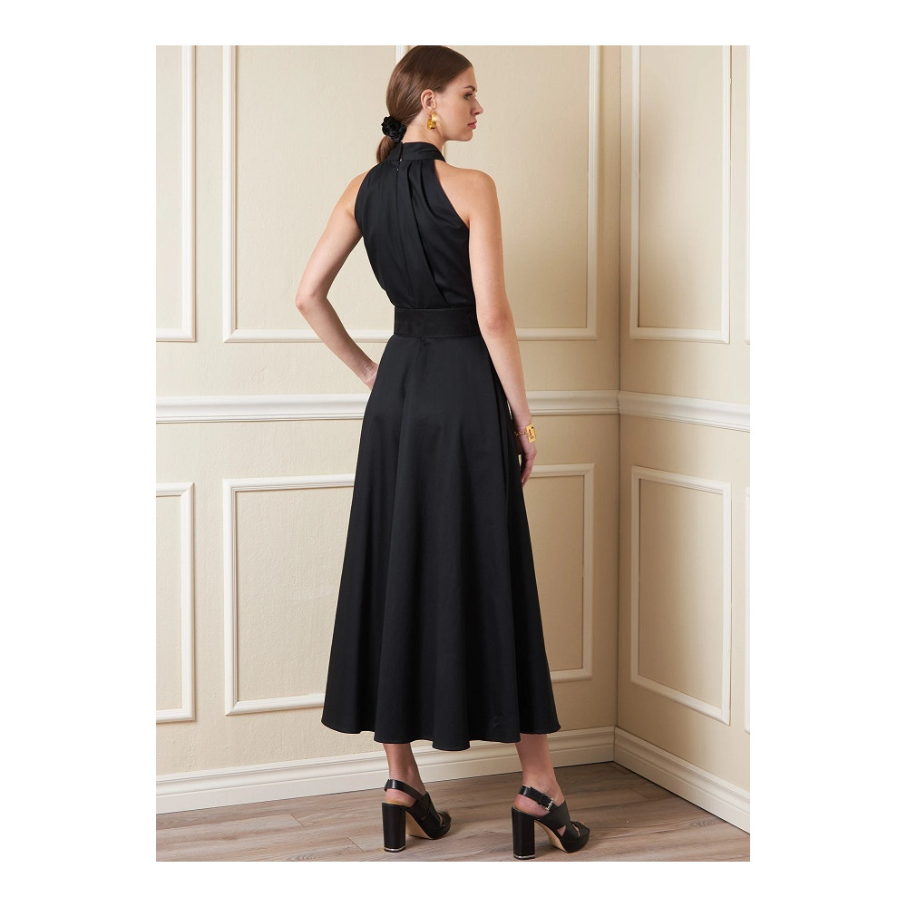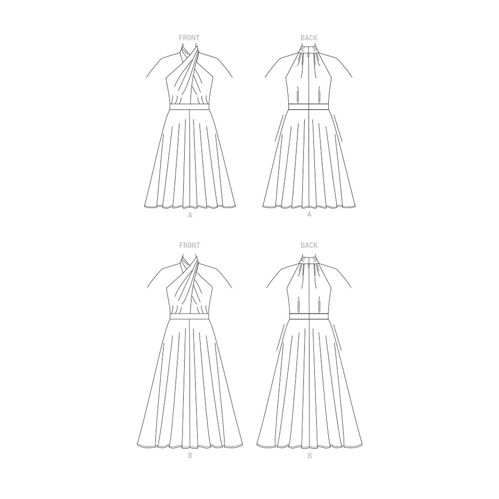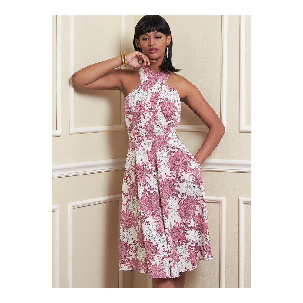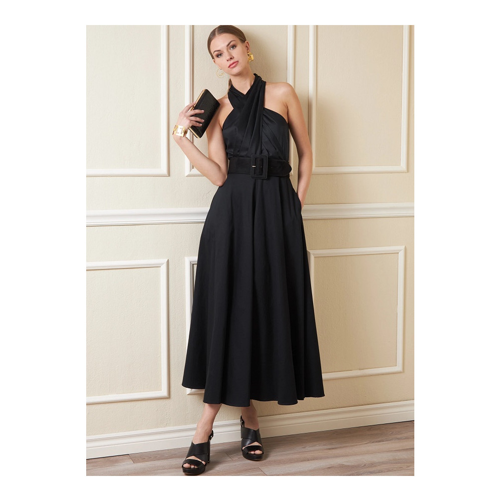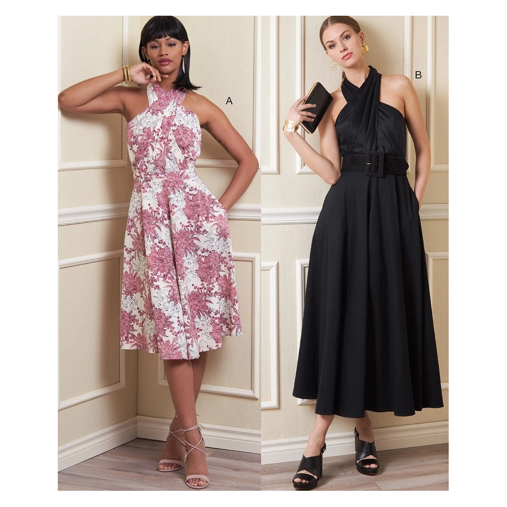 Střih Vogue na šaty za krk s překřížením a širokou sukní s kapsami ve švech