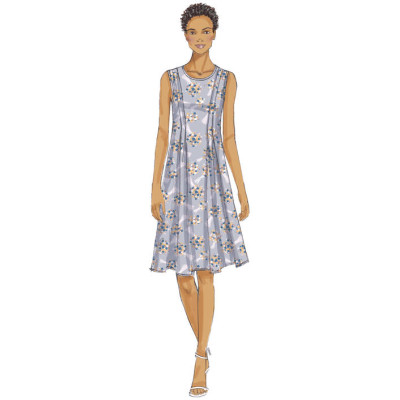 Střih Vogue na áčkové šaty bez rukávů se sukní ve dvou délkách se sklady.