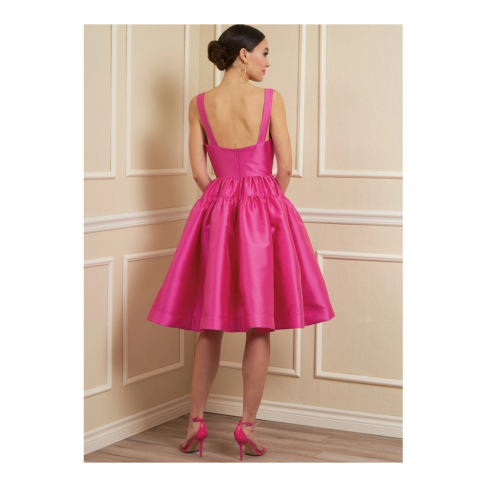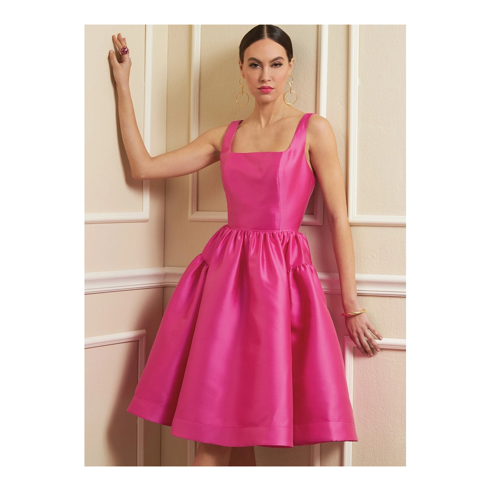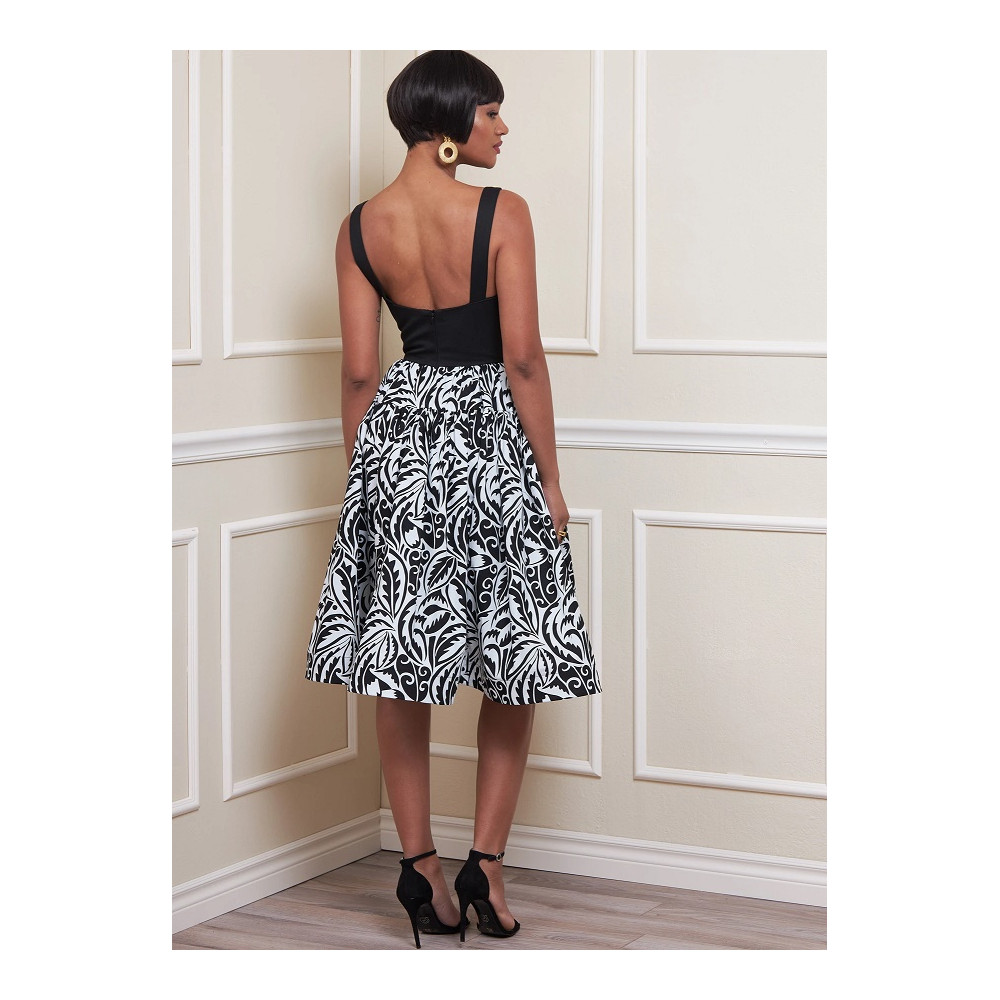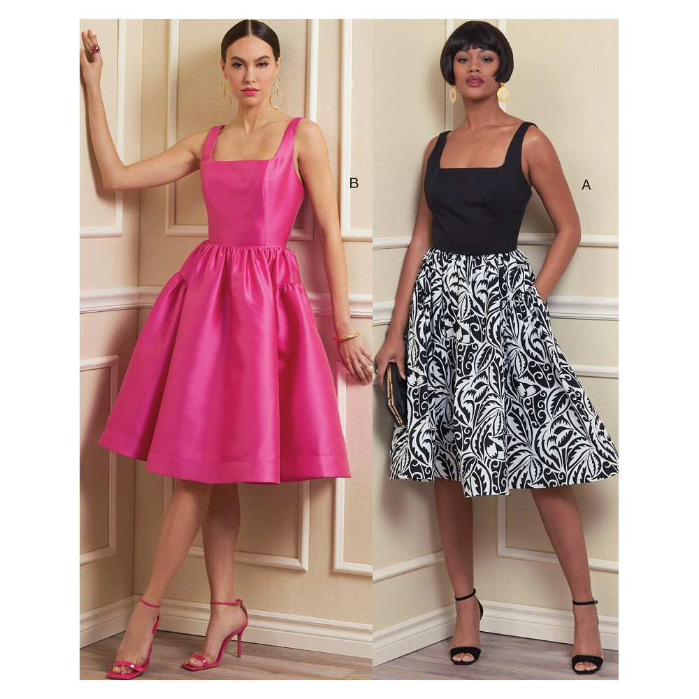Střih Vogue na šaty na ramínka se čtvercovým výstřihem a širokou nabíranou sukní pod kolena