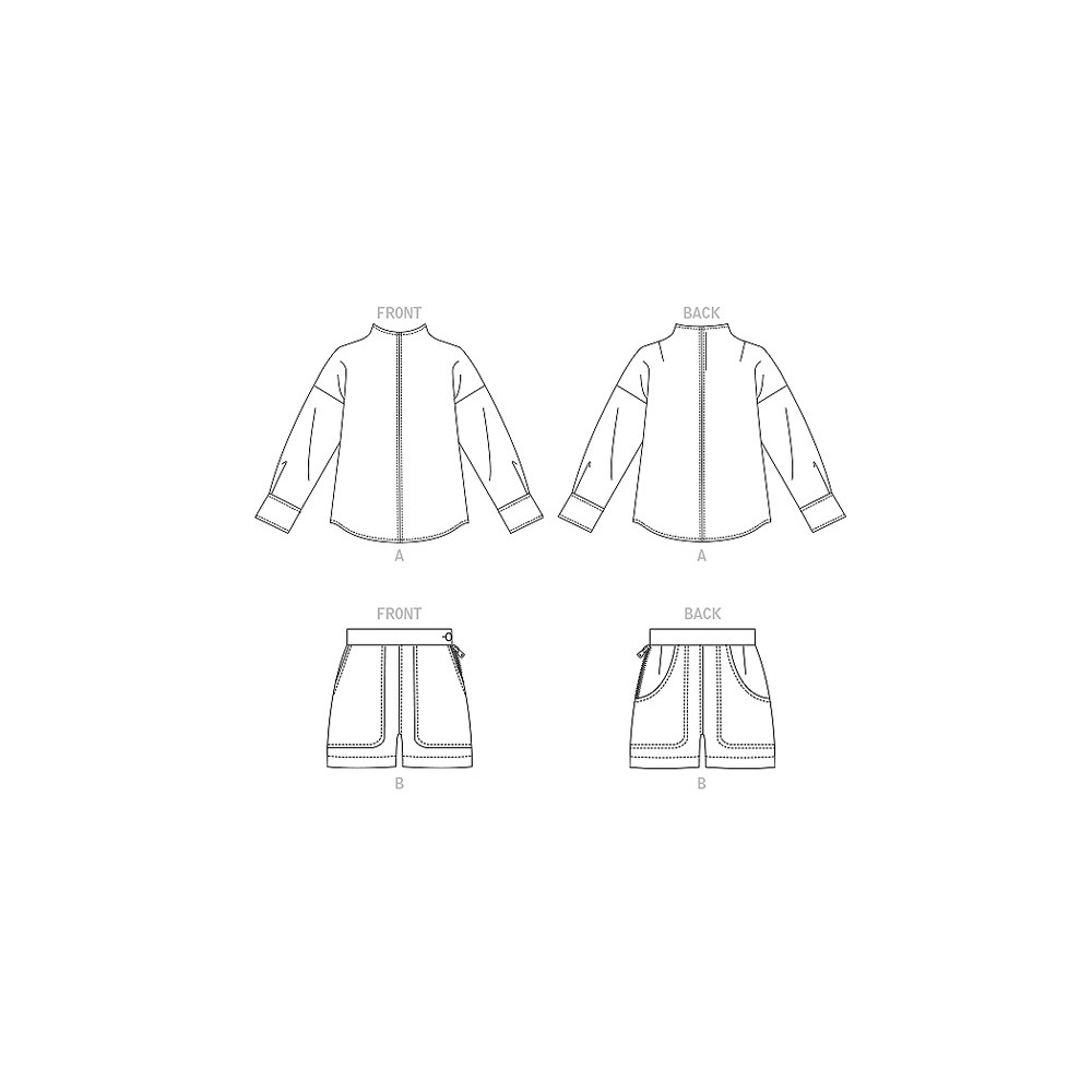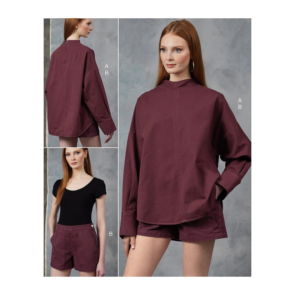 Návrhářský střih Vogue na volný top s dlouhým rukávem a šortky s velkými kapsami