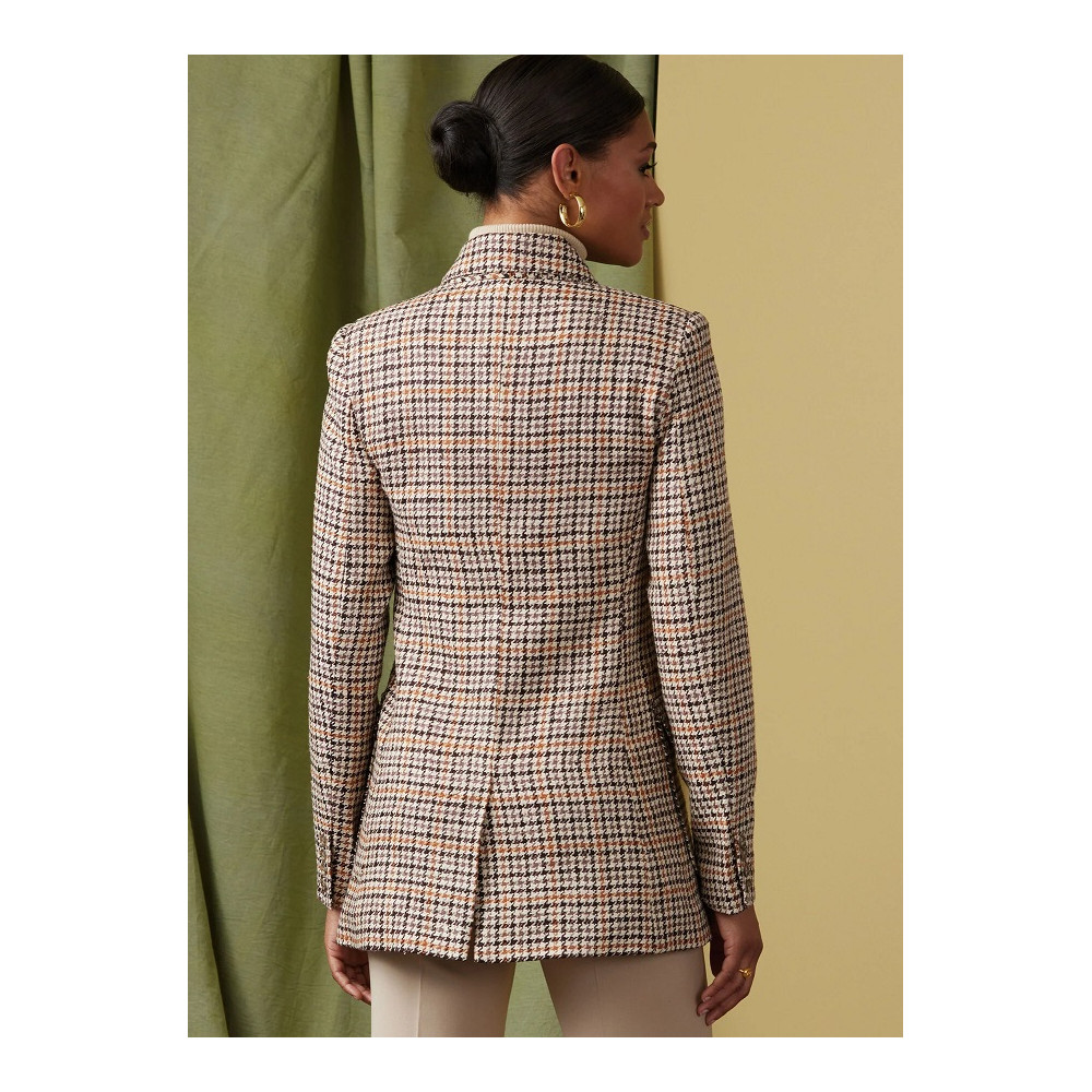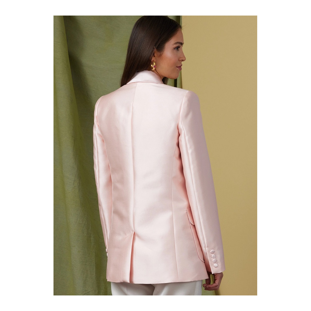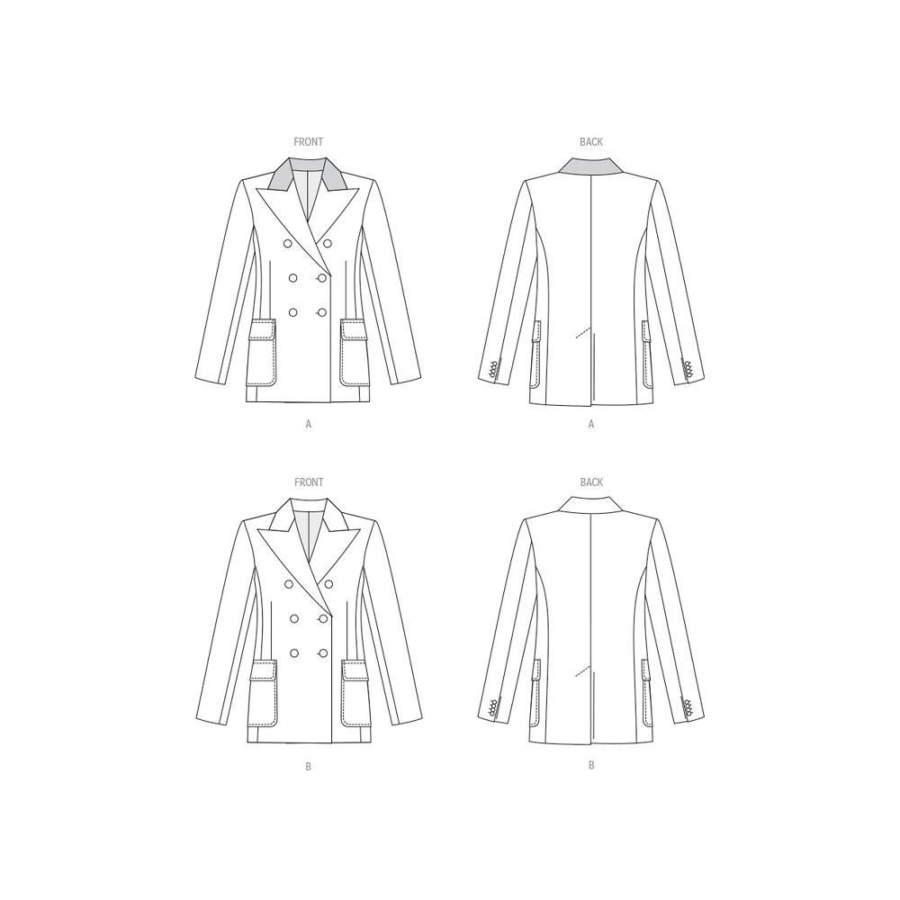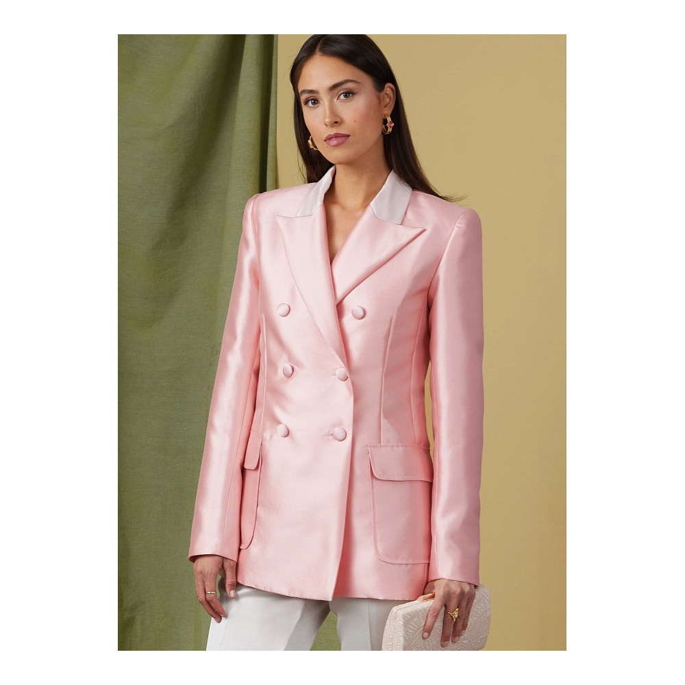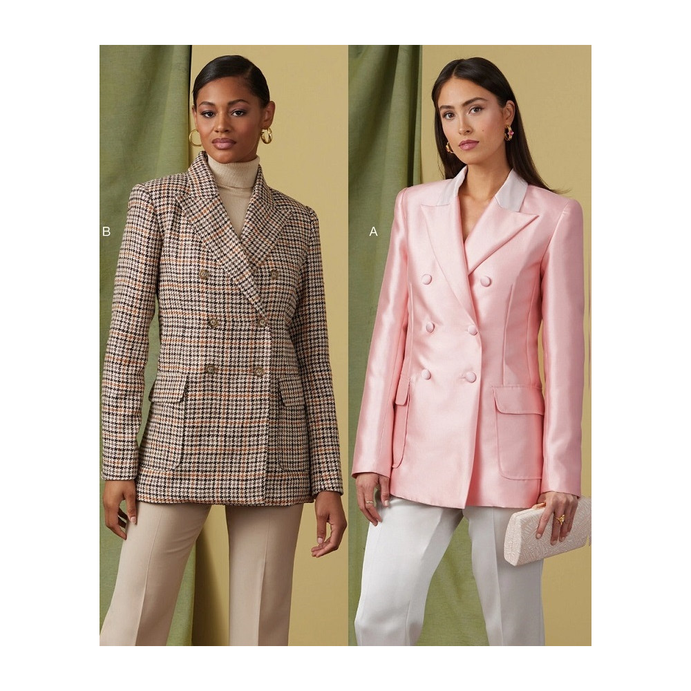 Střih Vogue na sako s dvouřadým zapínáním, klopovými kapsami a límcem s kontrastními látkami