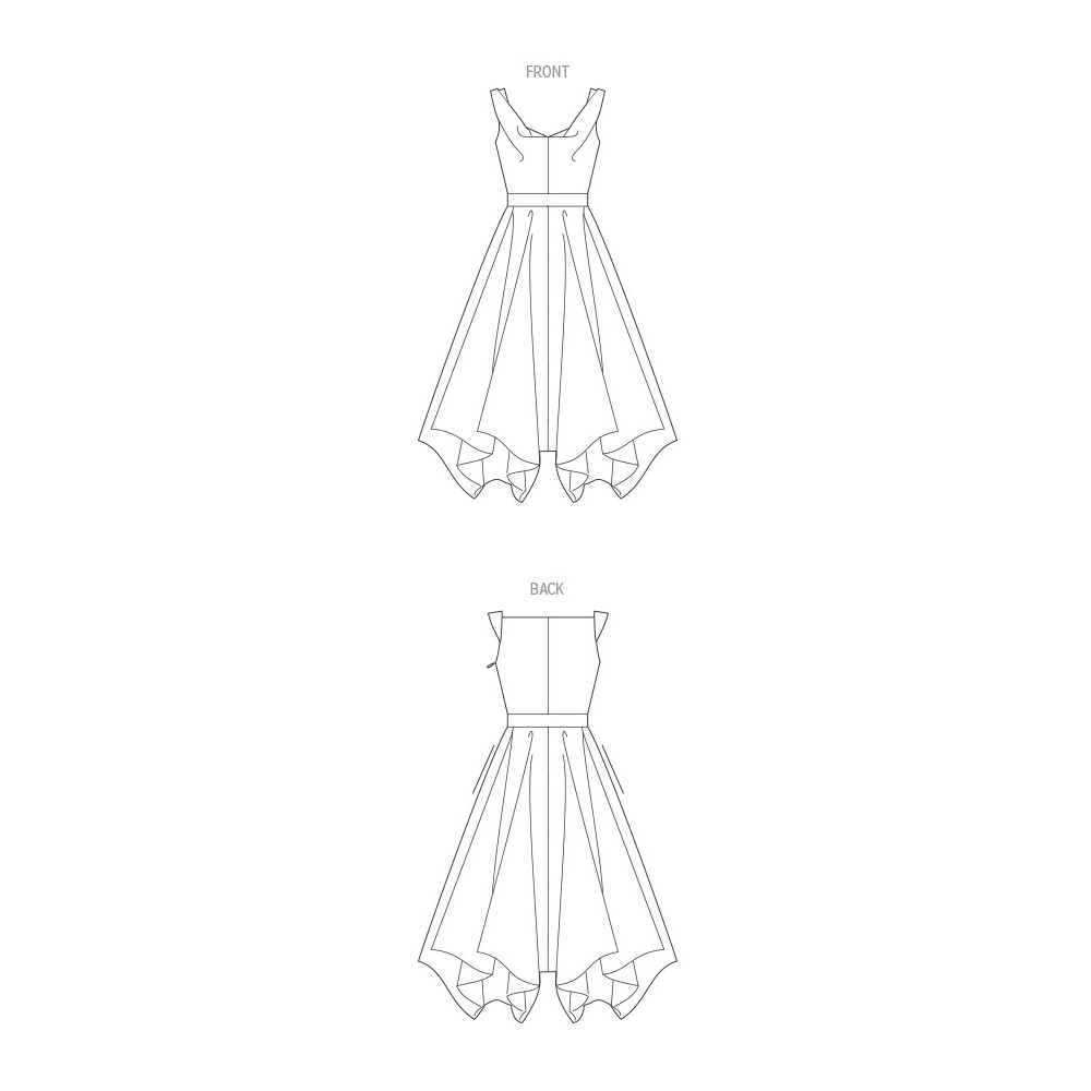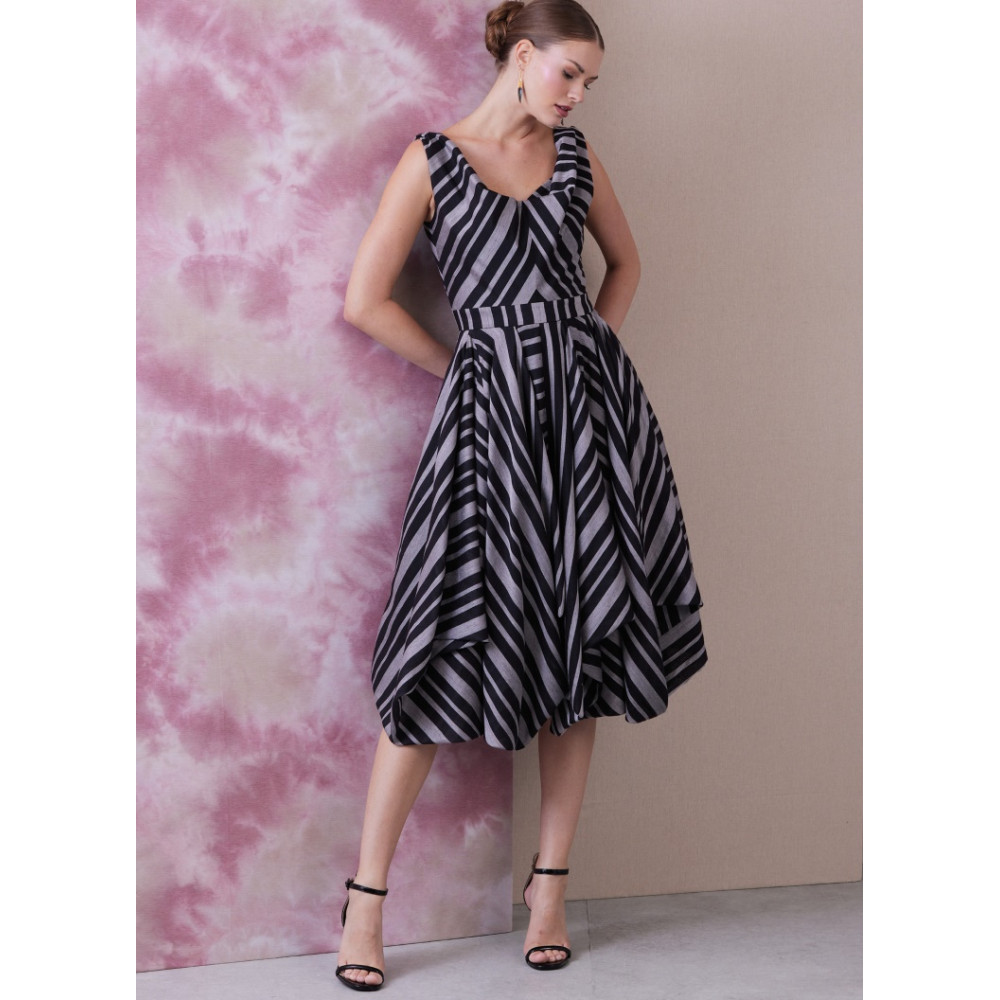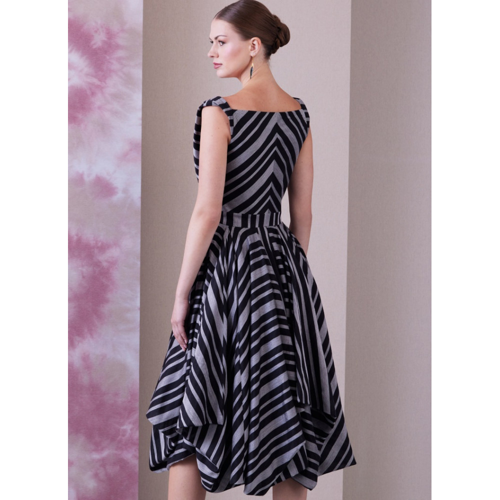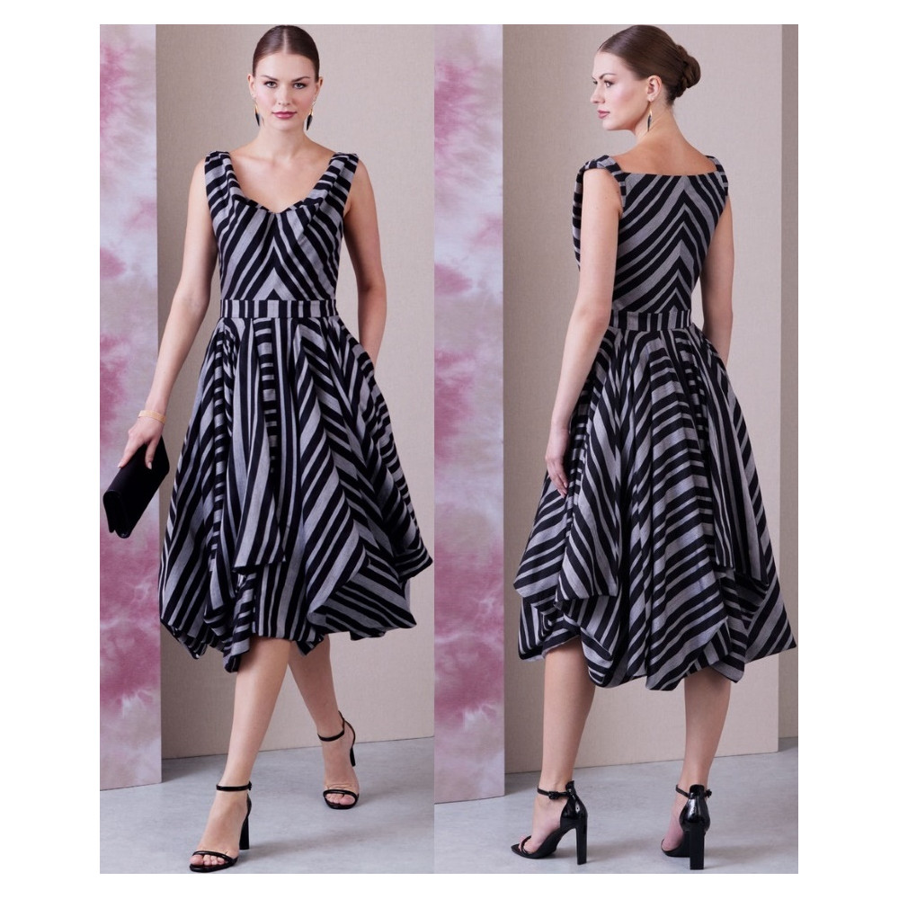 Návrhářský střih Vogue na šaty s velmi širokou sukní do cípů a kapsami v bočních švech