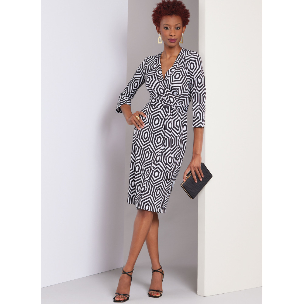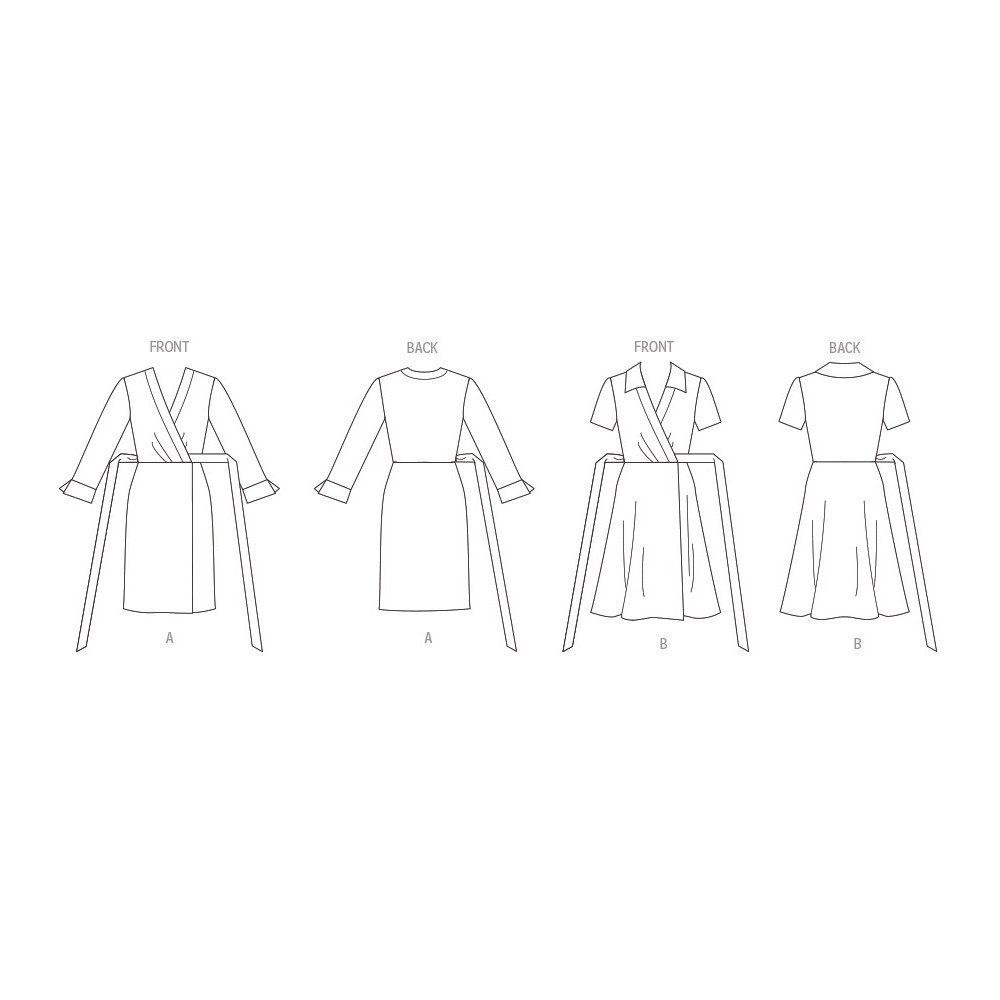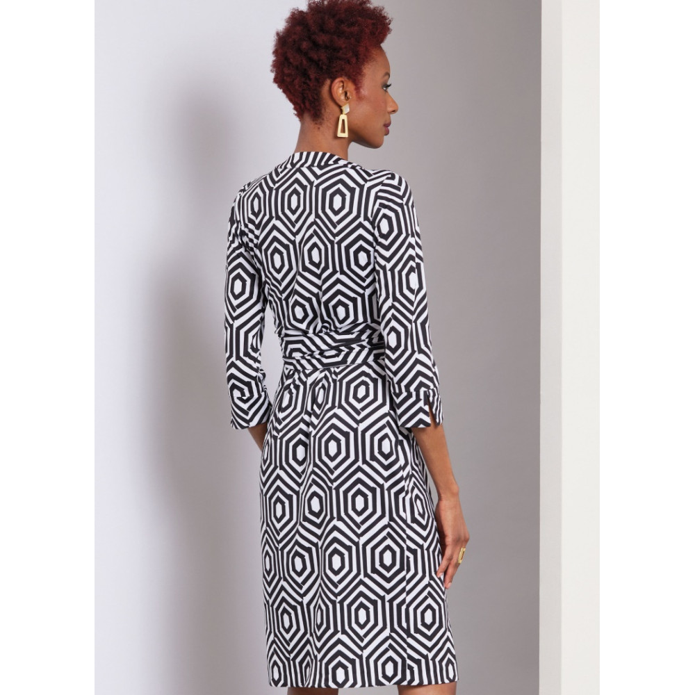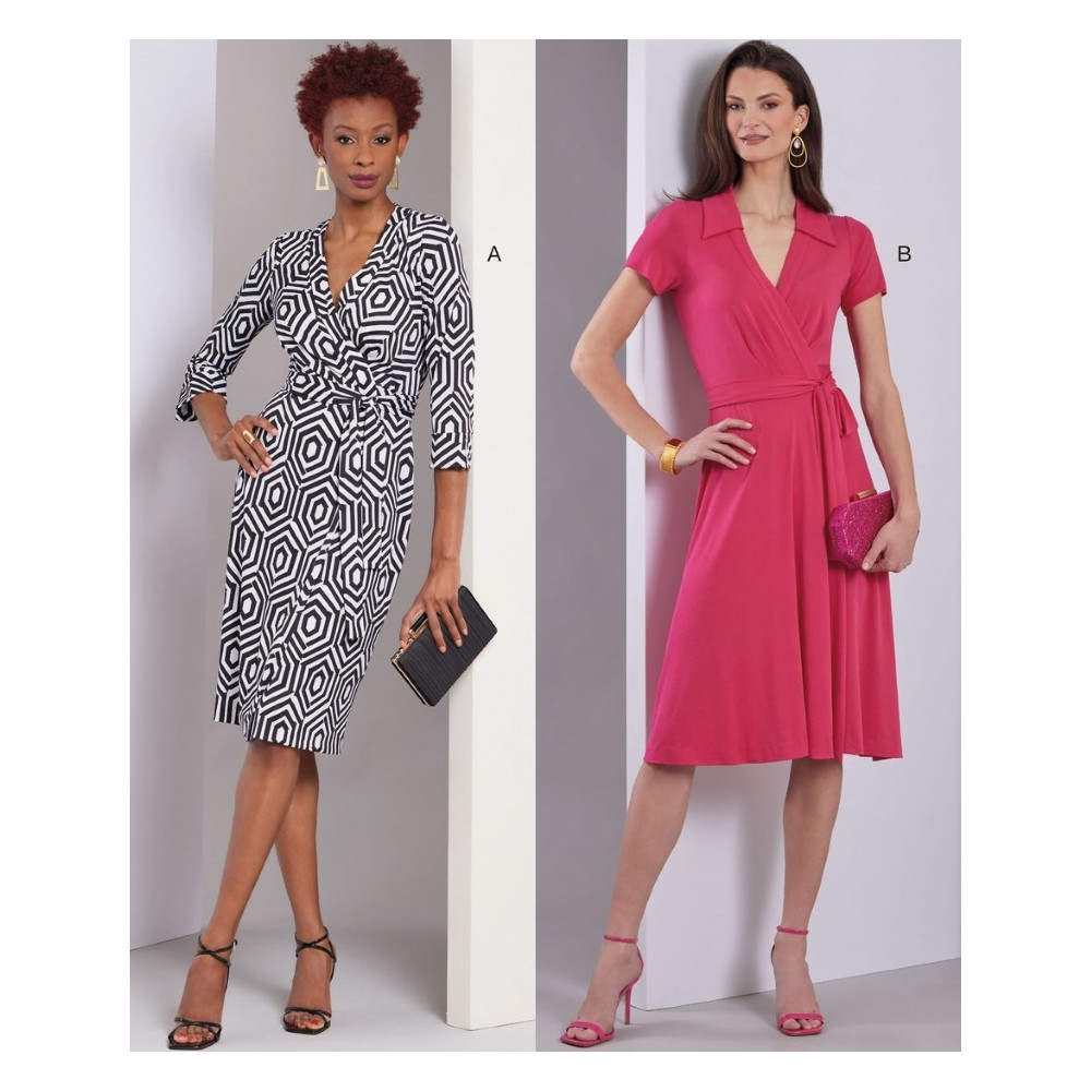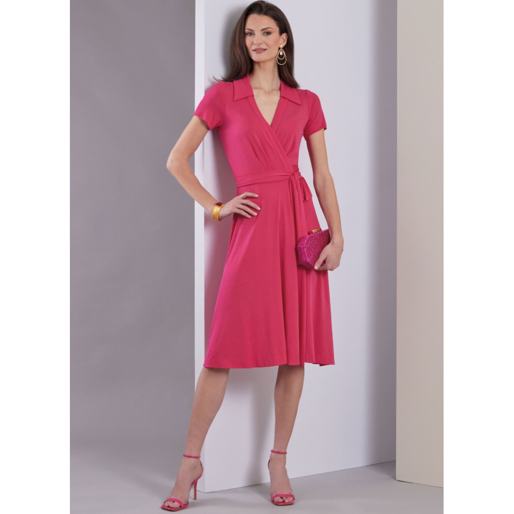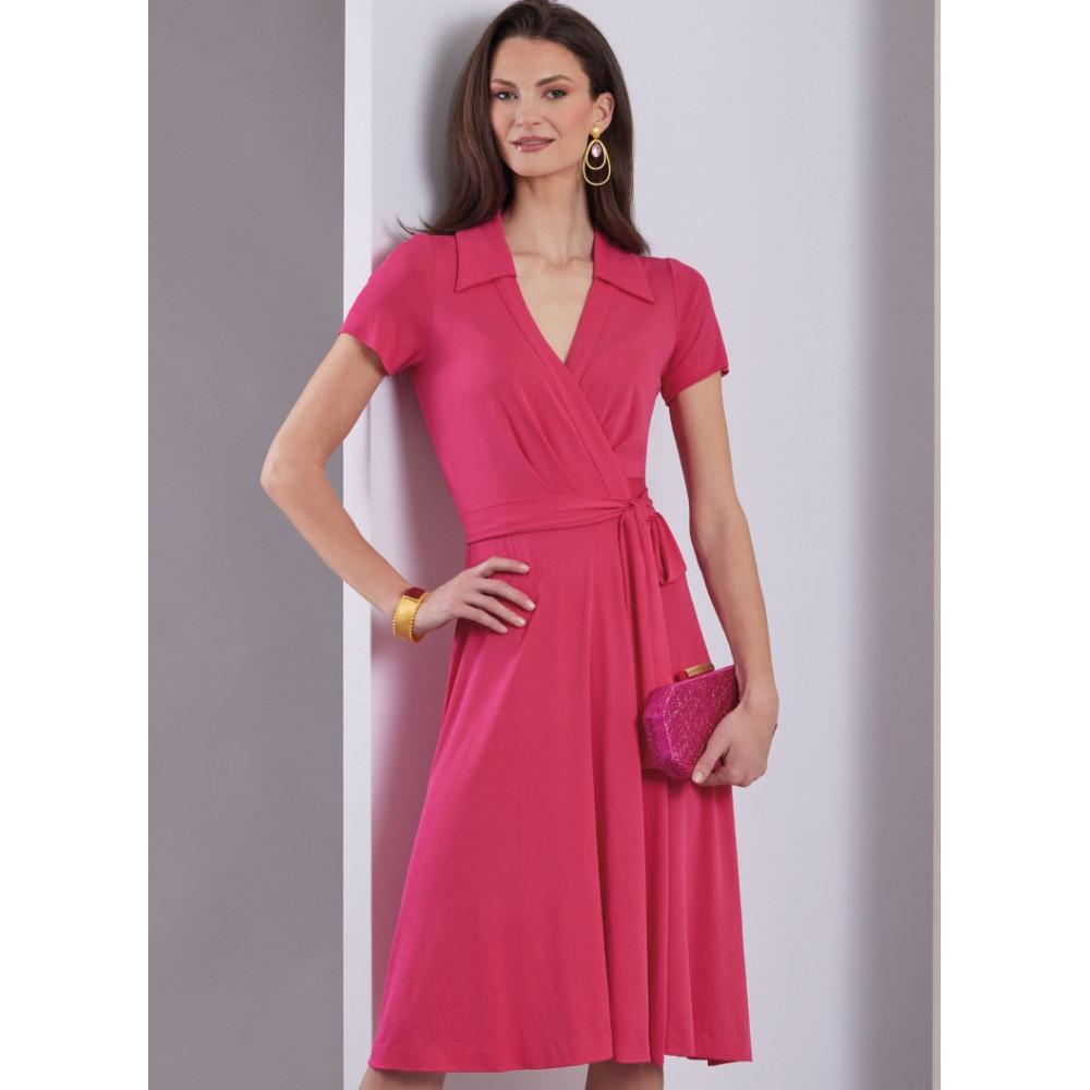 Střih Vogue na zavinovací šaty s límečkem a variantami rukávů a sukně