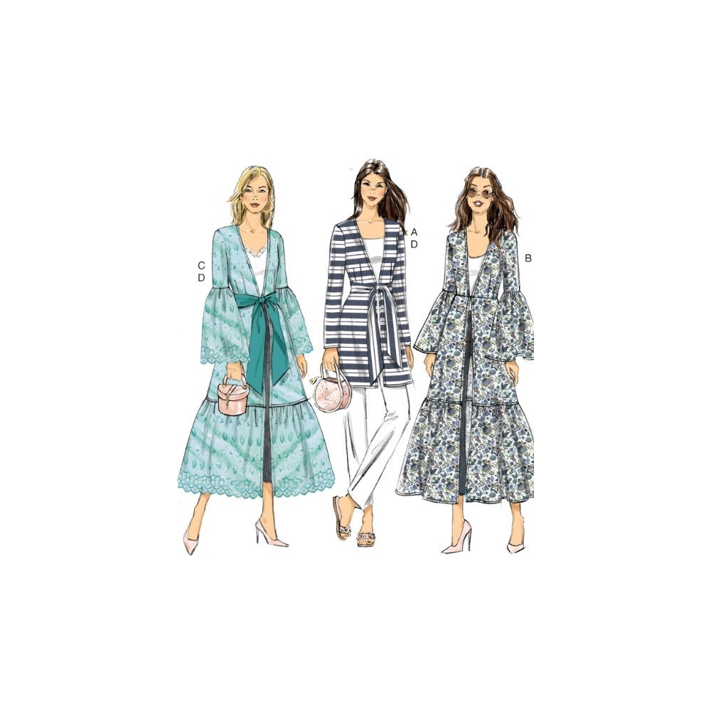 Jednoduchý střih Vogue na kabátek (svrchní šaty) s variantami rukávů a rozšířenou sukní s volány