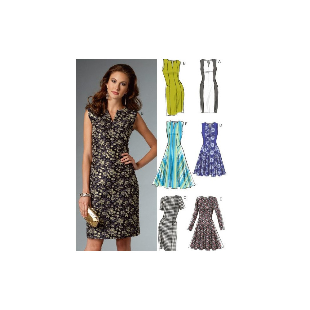 Střih Vogue na varianty šatů s kulatým výstřihem, bez rukávů nebo s rukávem, projmutým živůtkem a...