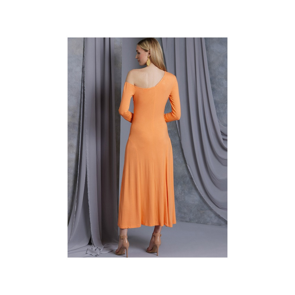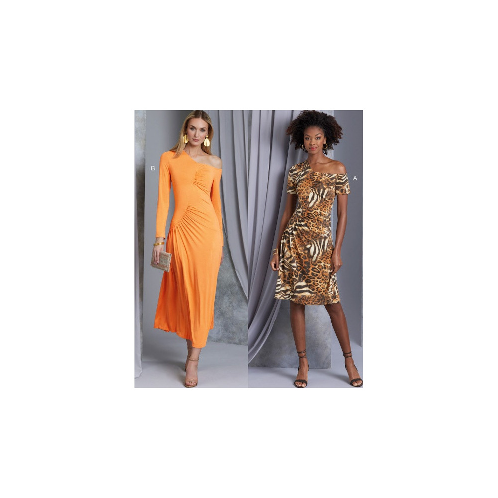 Střih Vogue na nabírané šaty s asymetrickým výstřihem a variantami rukávů