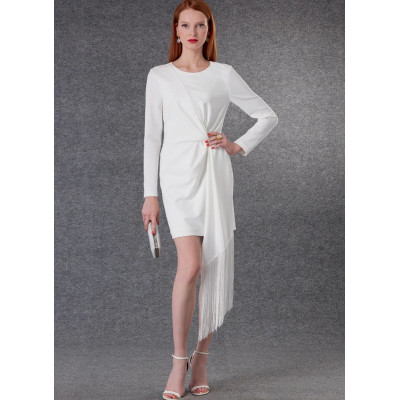 Návrhářský střih Vogue na šaty s dlouhým rukávem, asymetrickým drapé a třásněmi