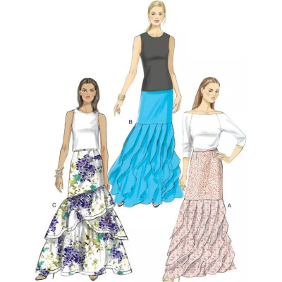 Střih Vogue na dlouhou sukni s tvarovacími záševky v pase a variantami volánů