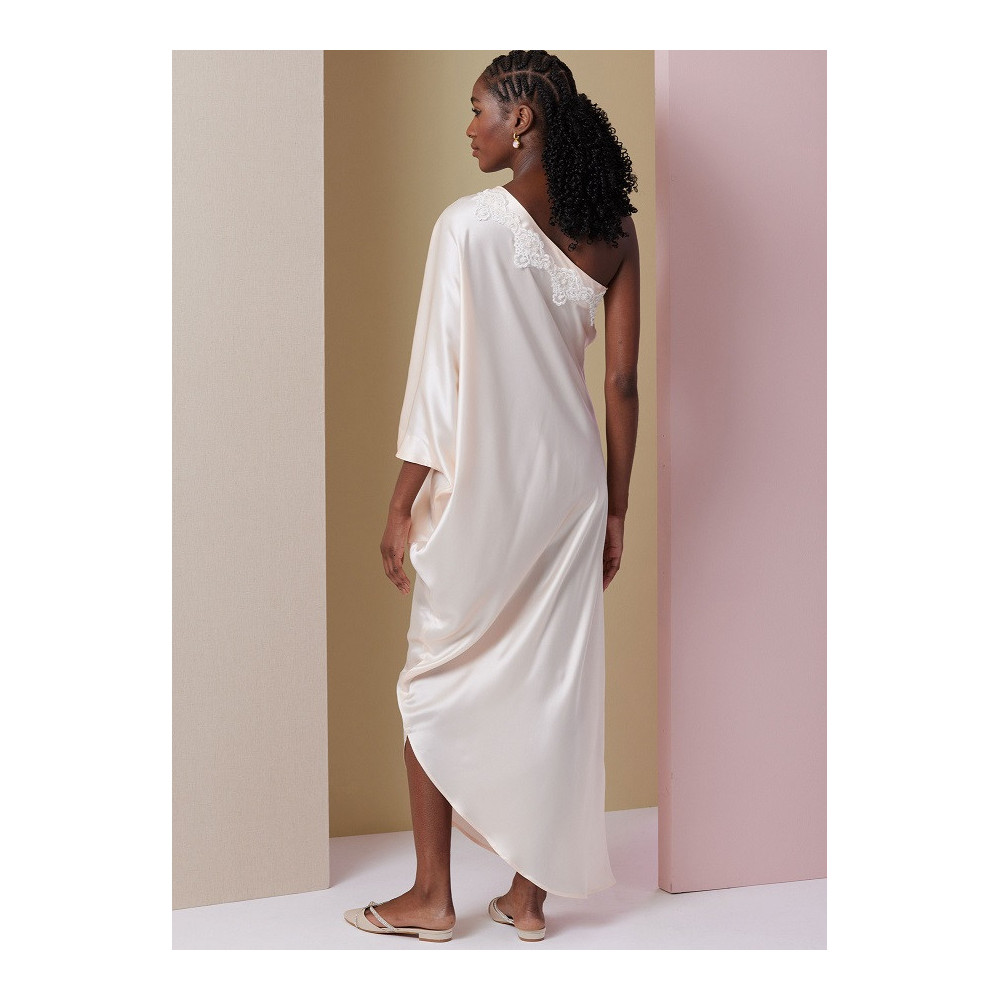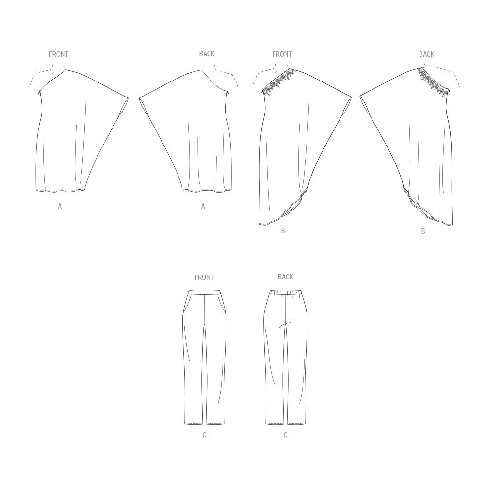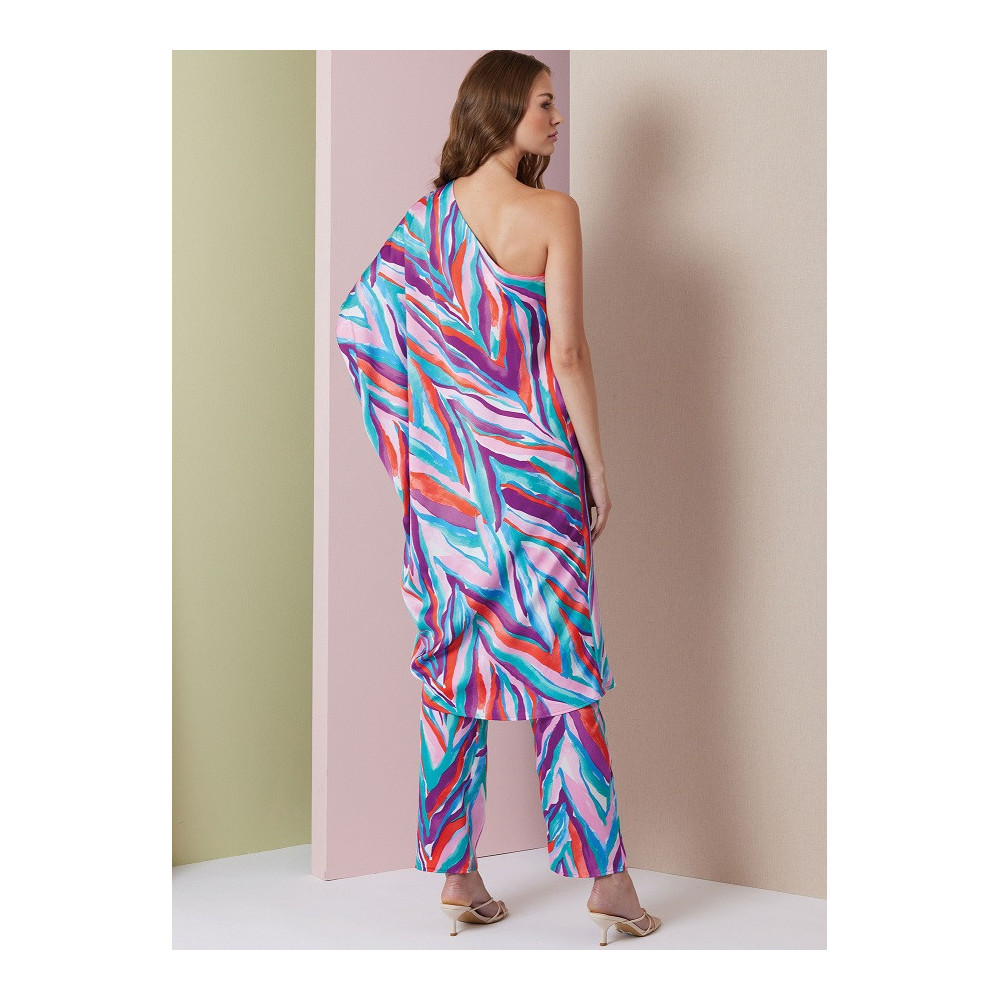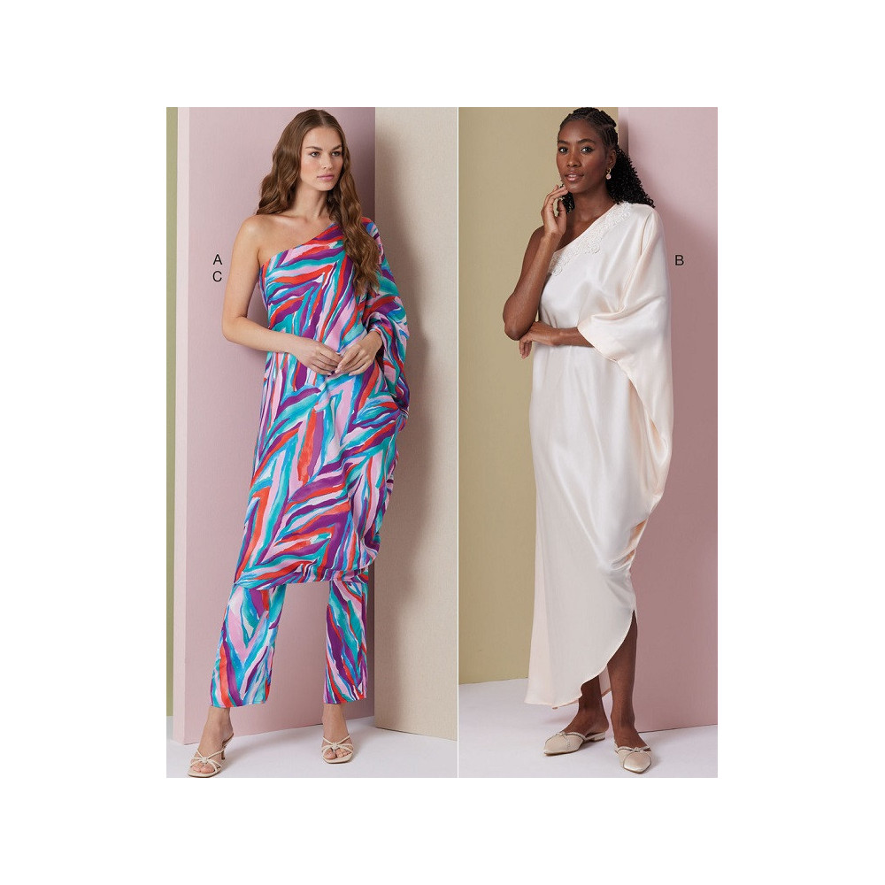 Střih Vogue na volné šaty na jedno rameno a kalhoty s gumou v zadním pase a rovnými nohavicemi