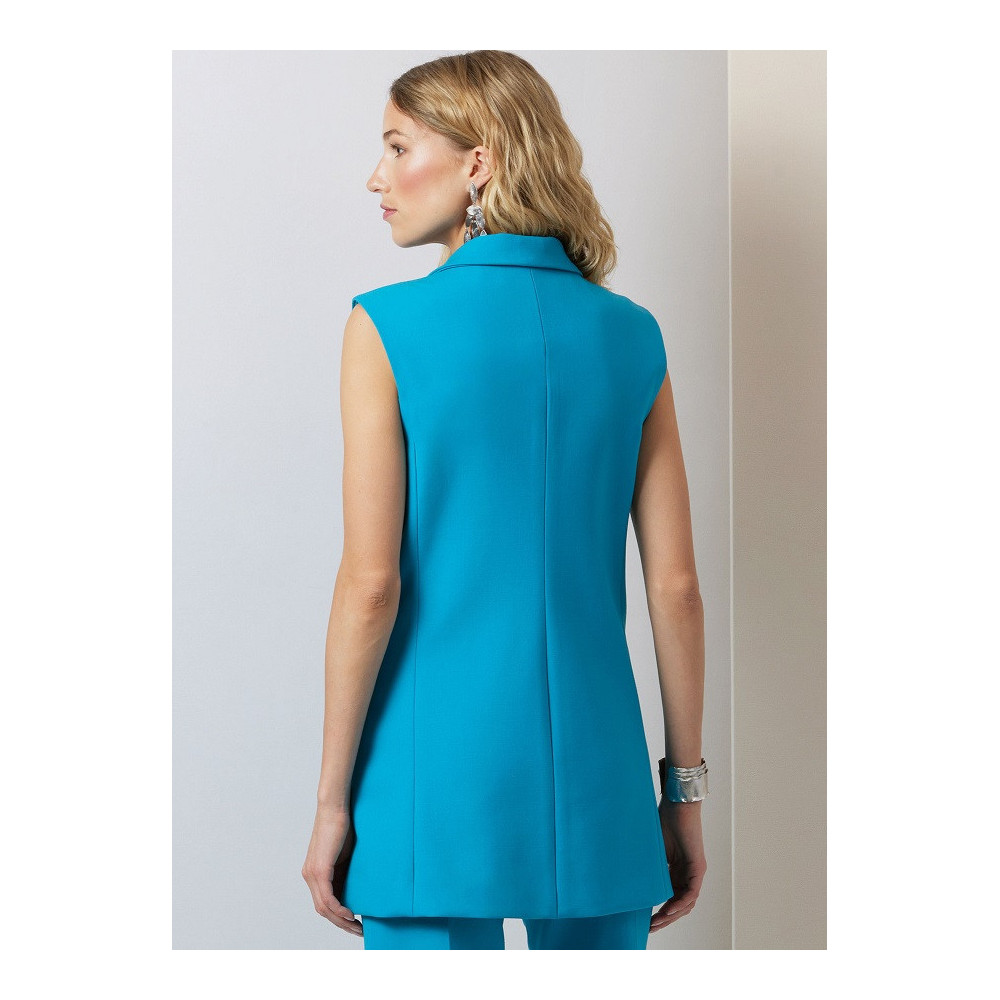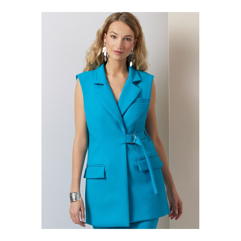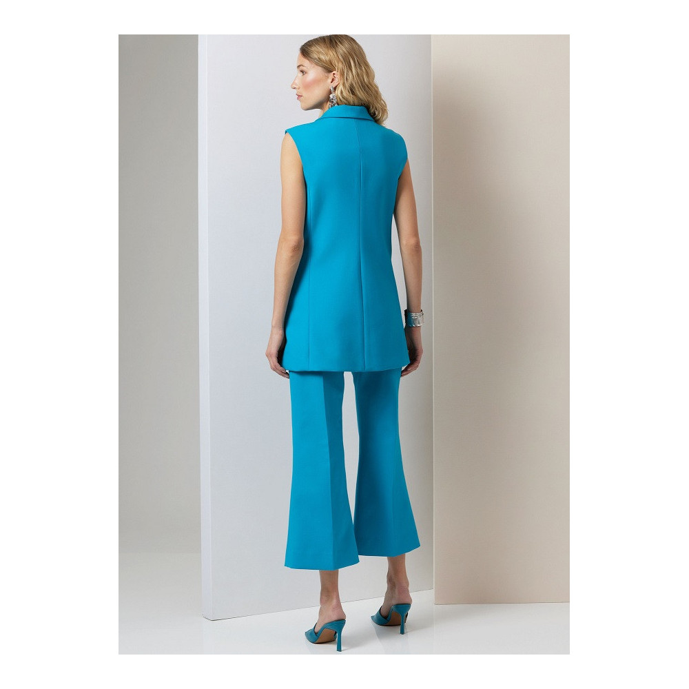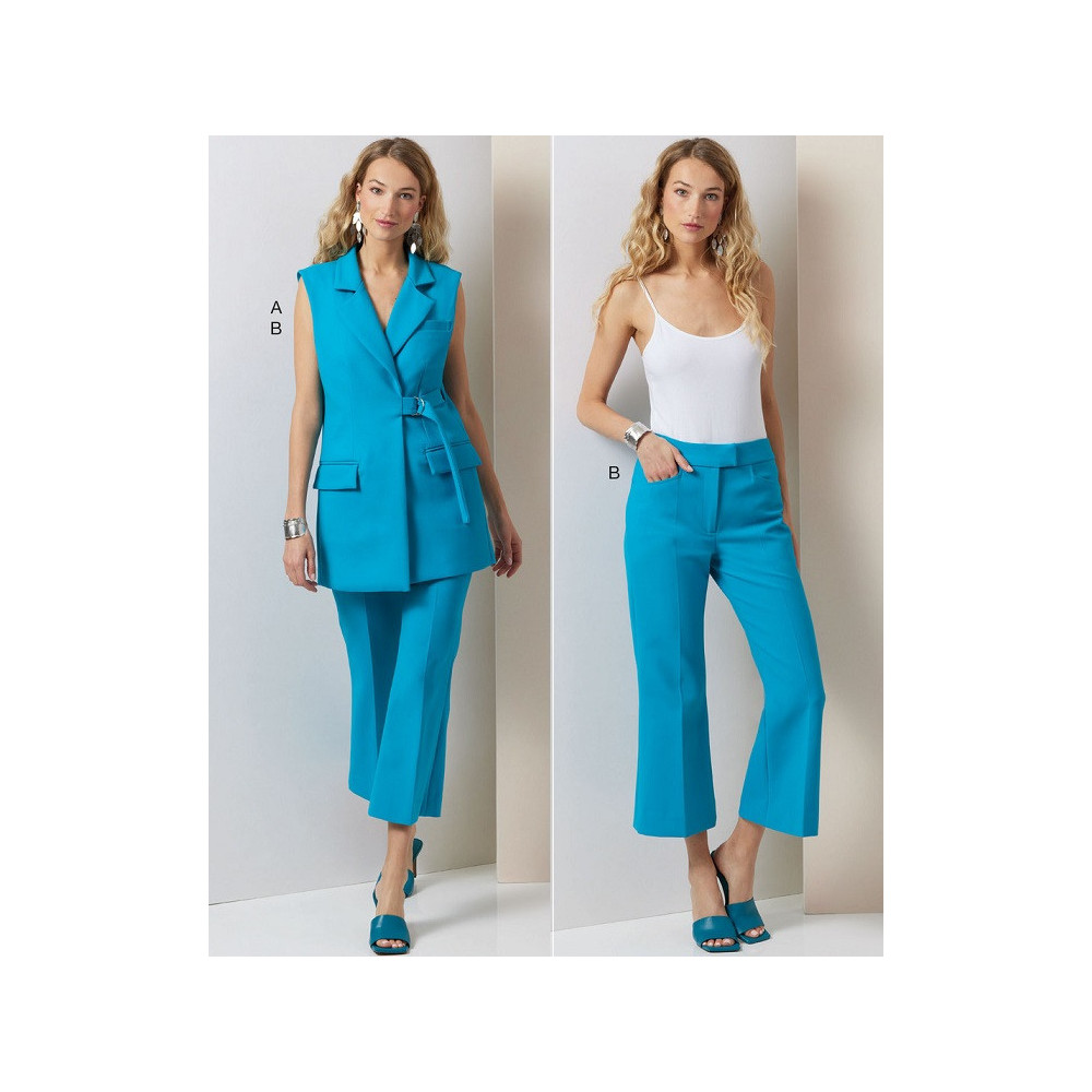 Střih Vogue na vestu s klopovým límcem a vázáním s D-kroužkem a kalhoty s vysokým pasem se zvonovými nohavicemi s puky