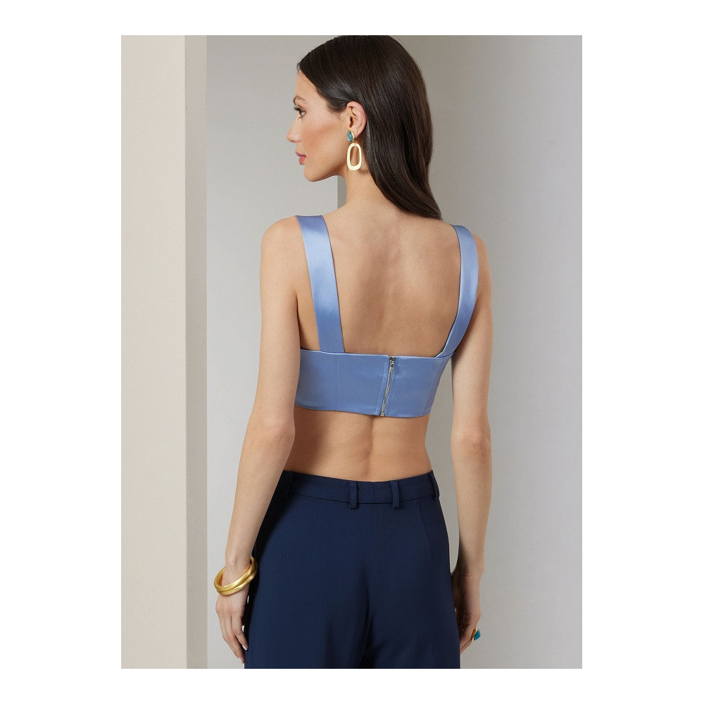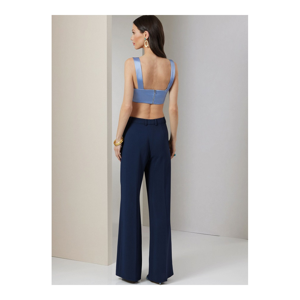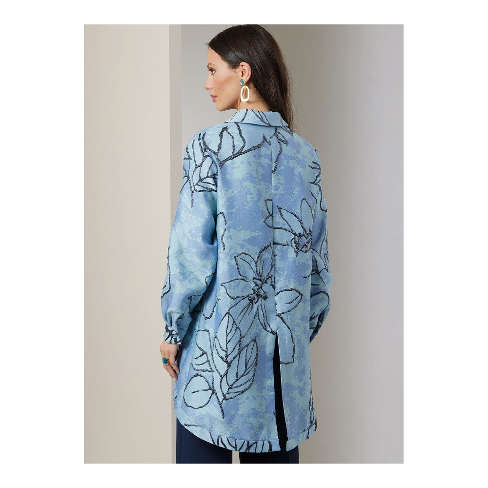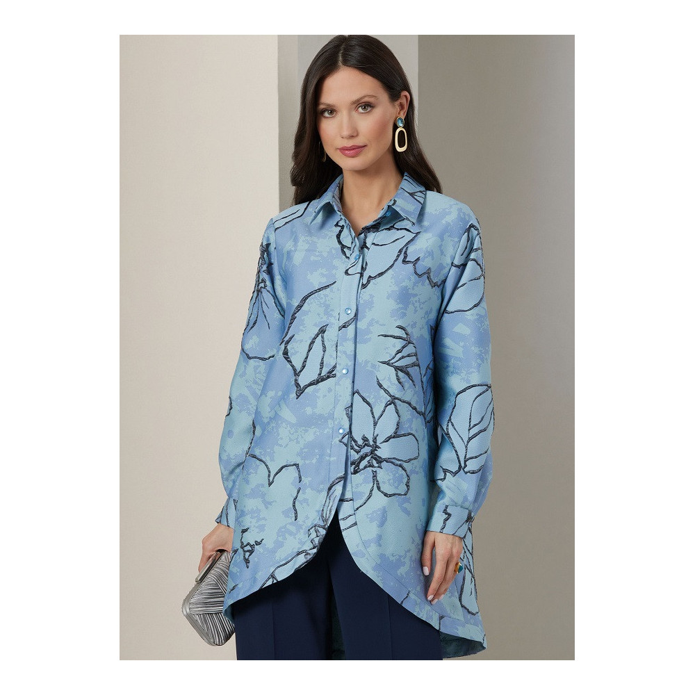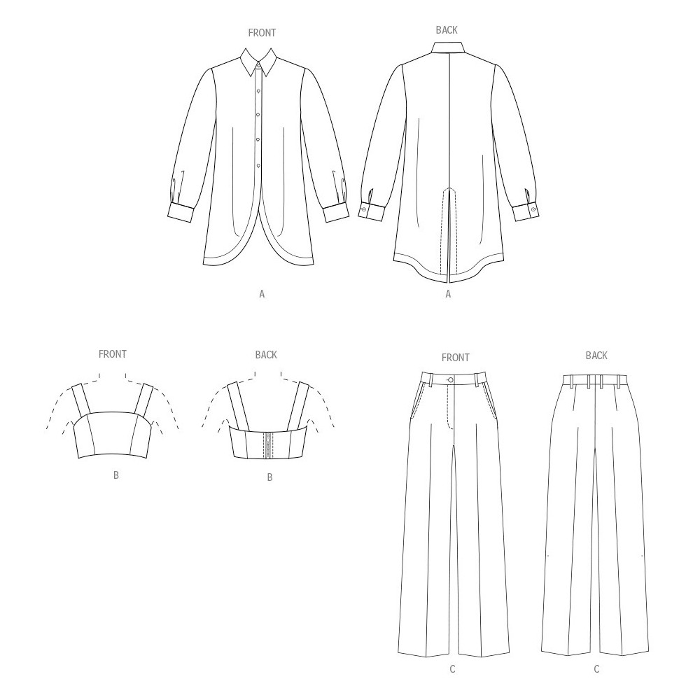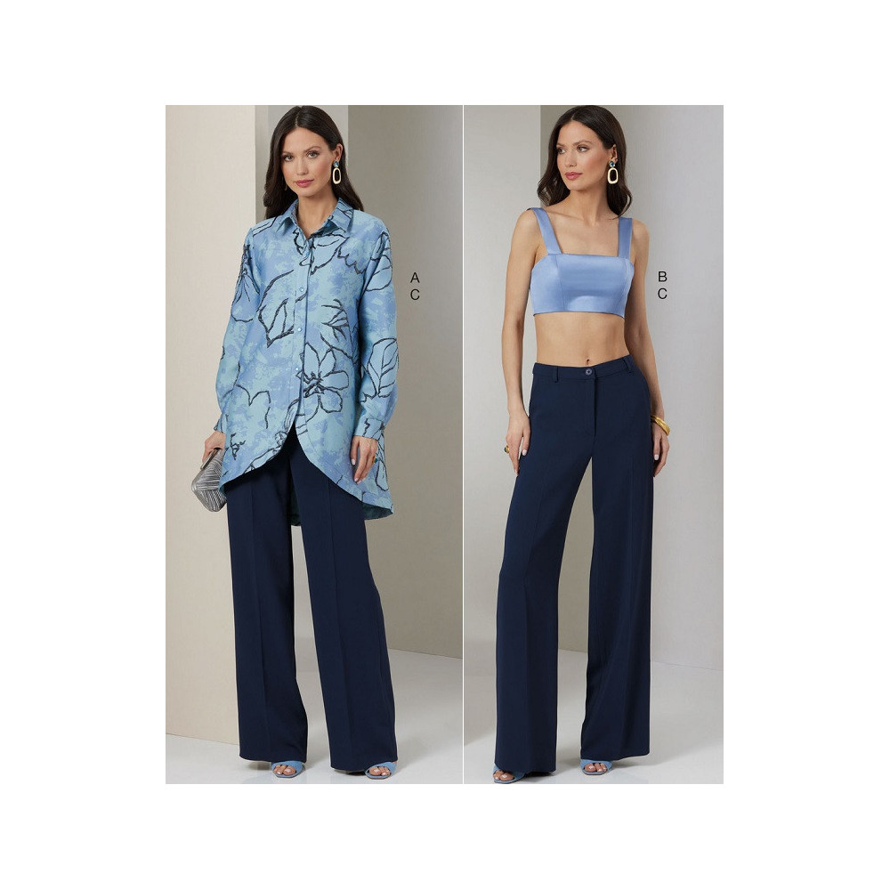 Střih Vogue na volnou dlouhou košili s tvarovanou záložkou a zadním rozparkem, podprsenkový top na ramínka a zapínáním na zip a kalhoty se širokými nohavicemi a puky