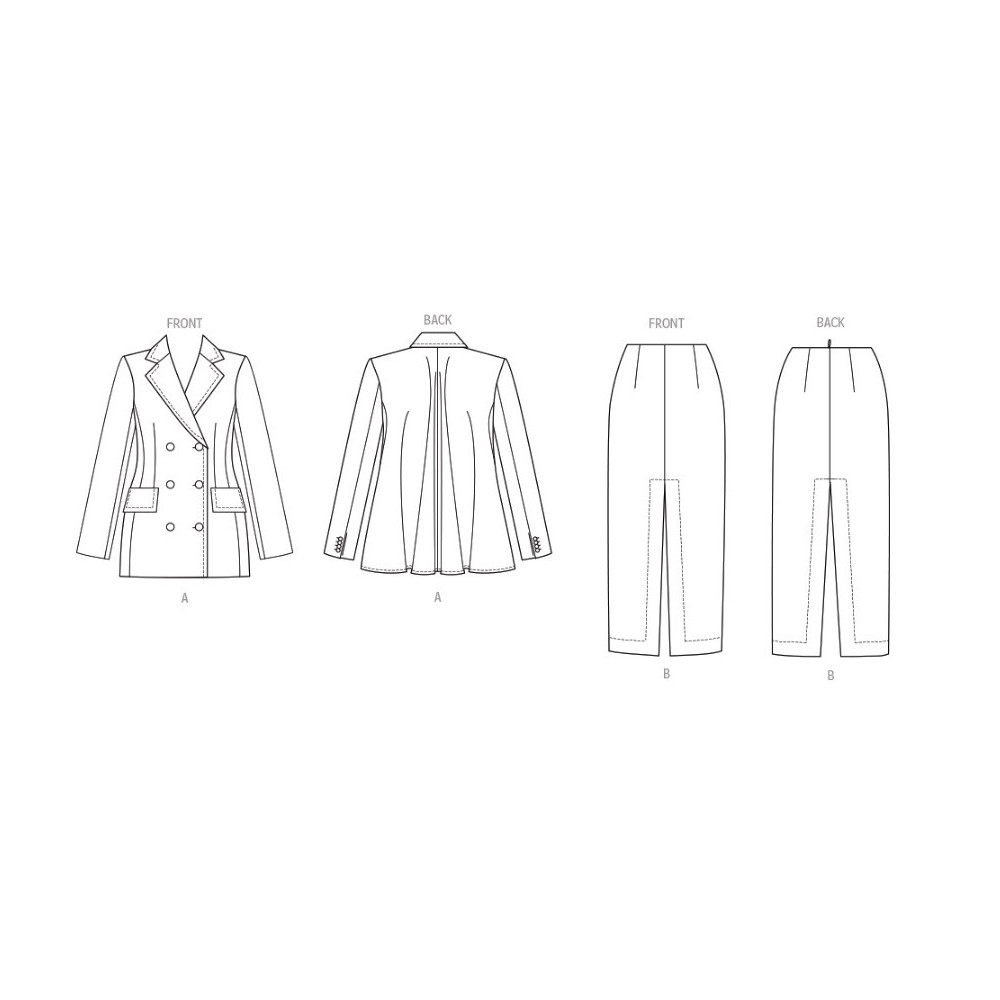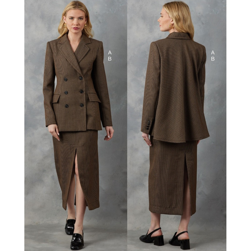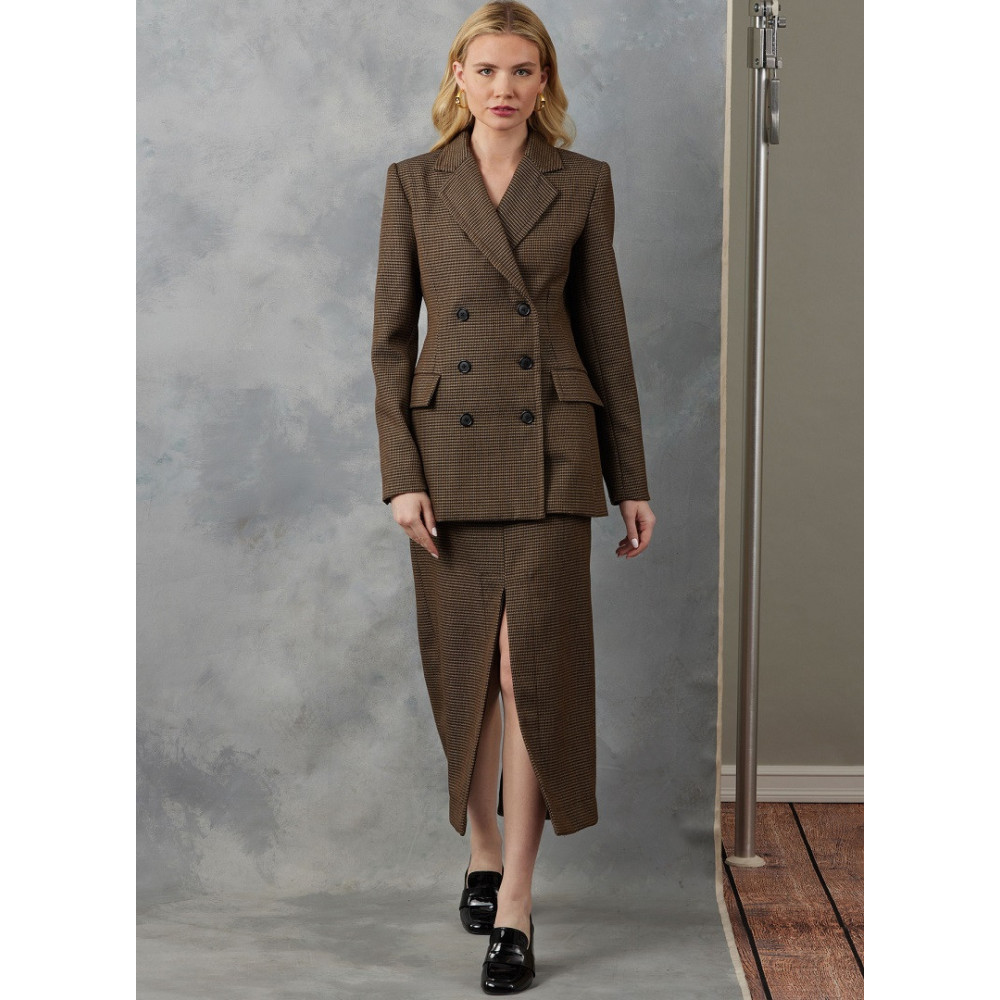 Střih Vogue na dvouřadé sako s klopovým límcem a volným zadním dílem a sukni v délce midi s předním a zadním rozparkem