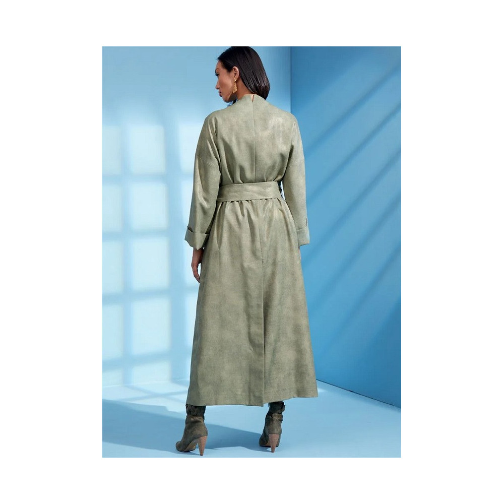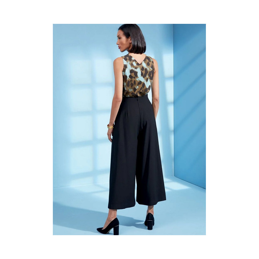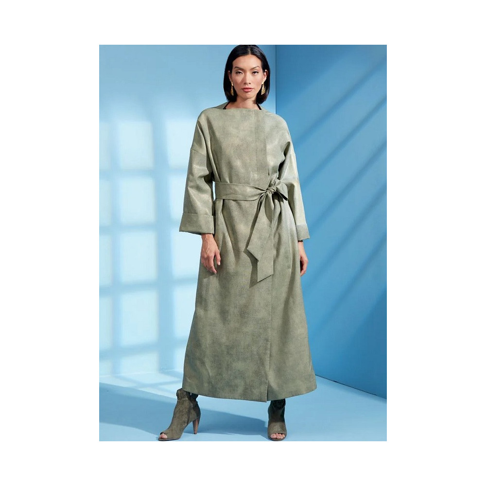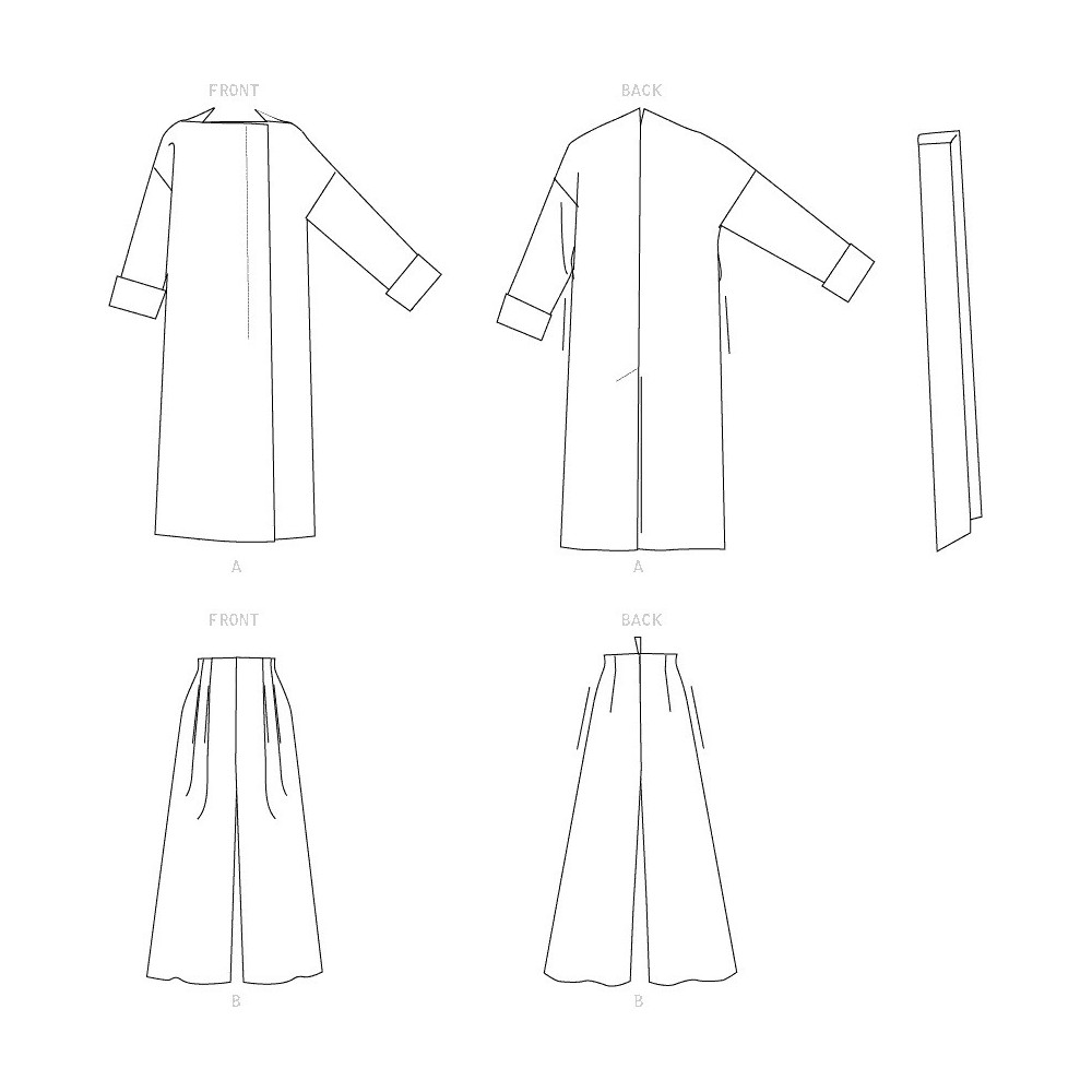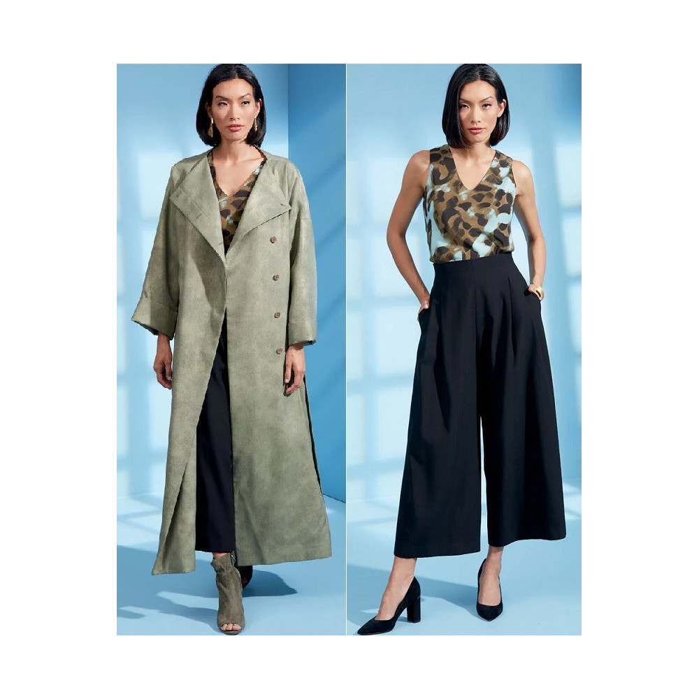 Návrhářský střih Vogue na kalhoty se širokými nohavicemi se sklady a dlouhý volný kabát bez límce se skrytým zapínáním, páskem a sesazenými rameny