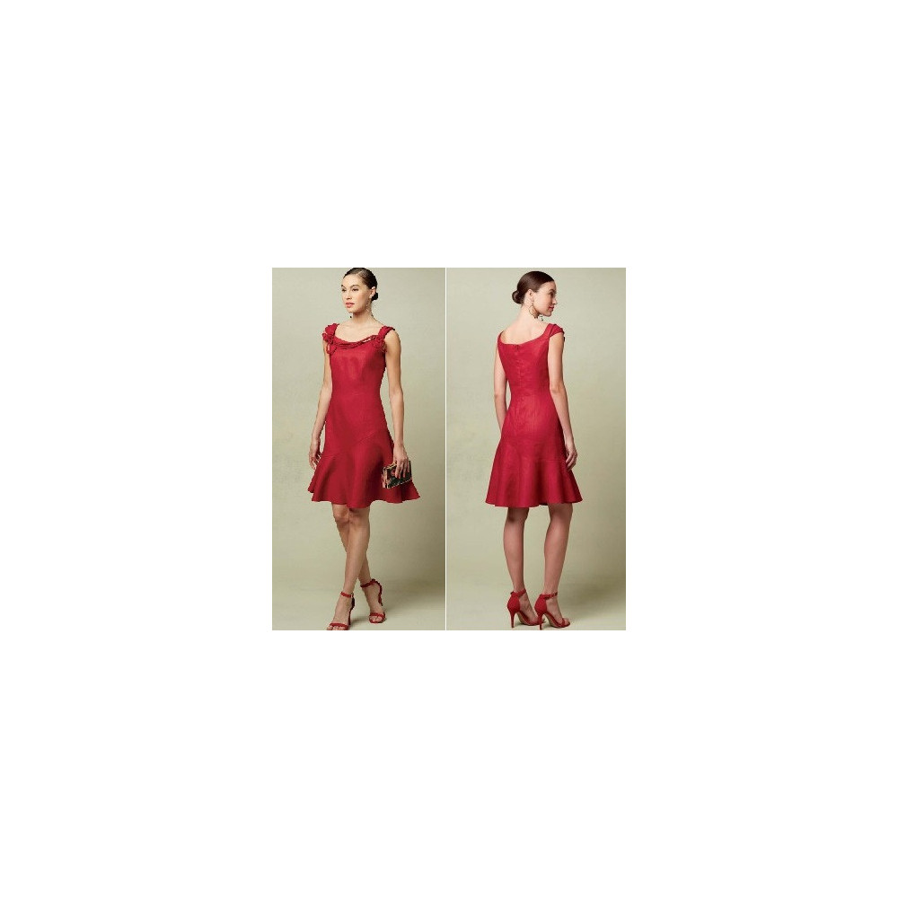 Návrhářský střih Vogue na šaty se širokými ramínky a ozdobnou aplikací v dekoltu, princesovými švy a volánovou sukní