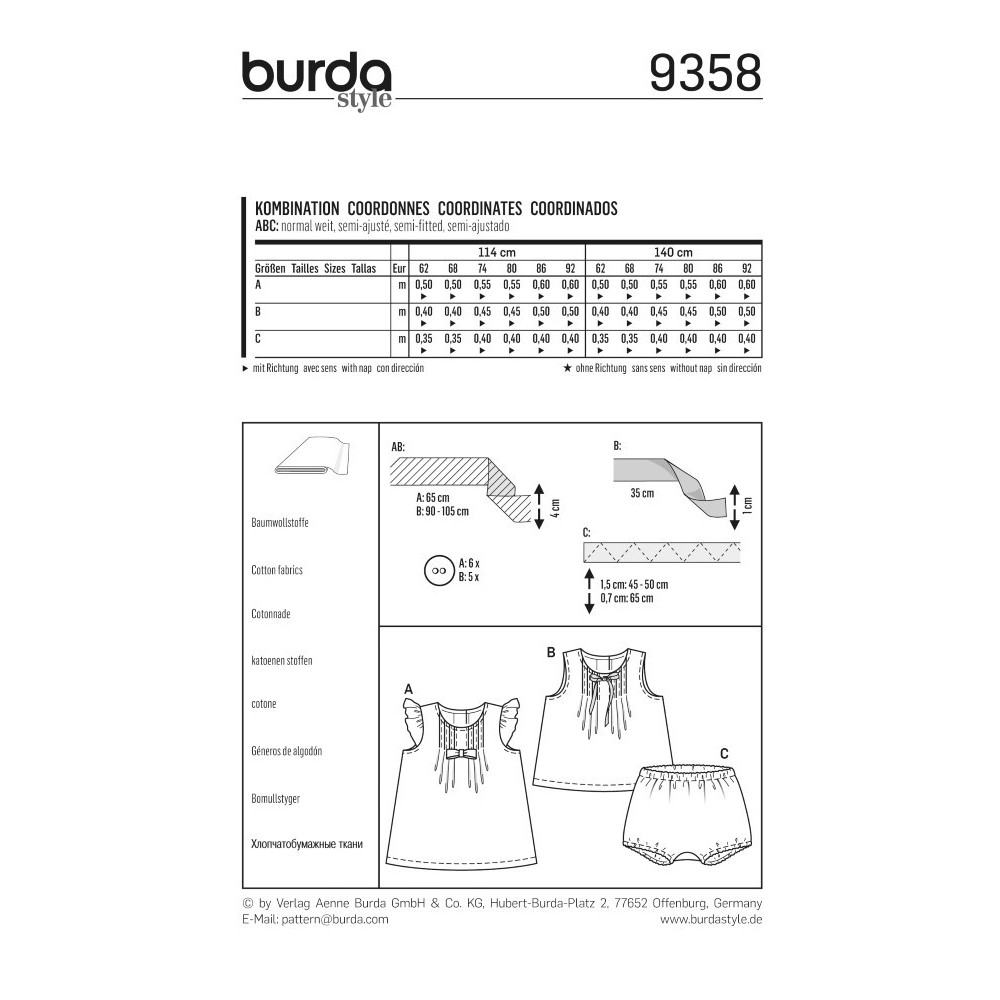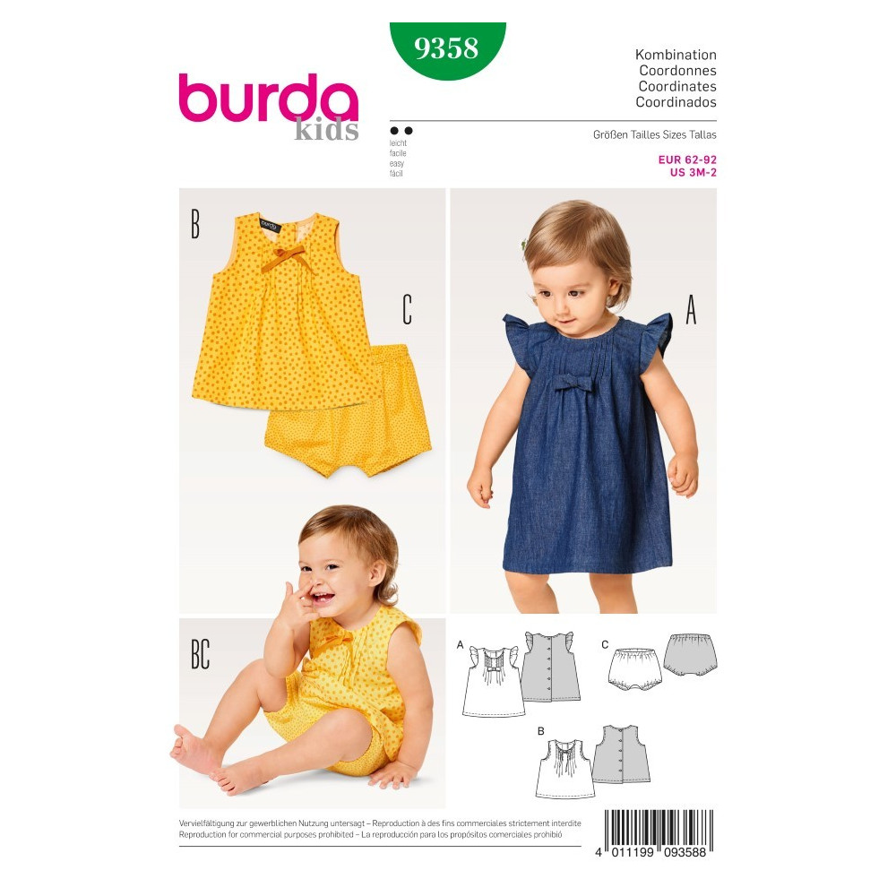 Více se dočtete v popisuStřih ve velikostech EUR 62-92, úroveň obtížnosti šití: 2 (lehká), doporučené látky: bavlna