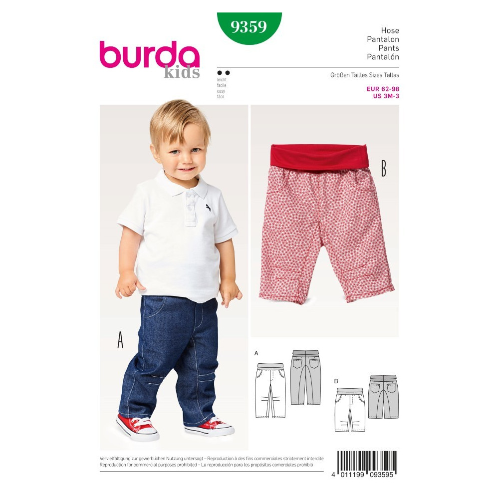 Více se dočtete v popisuStřih ve velikostech EUR 62-98, úroveň obtížnosti šití: 2 (lehká), doporučené látky: bavlna, lehčí džínovina, směsové látky, žerzej (pas)